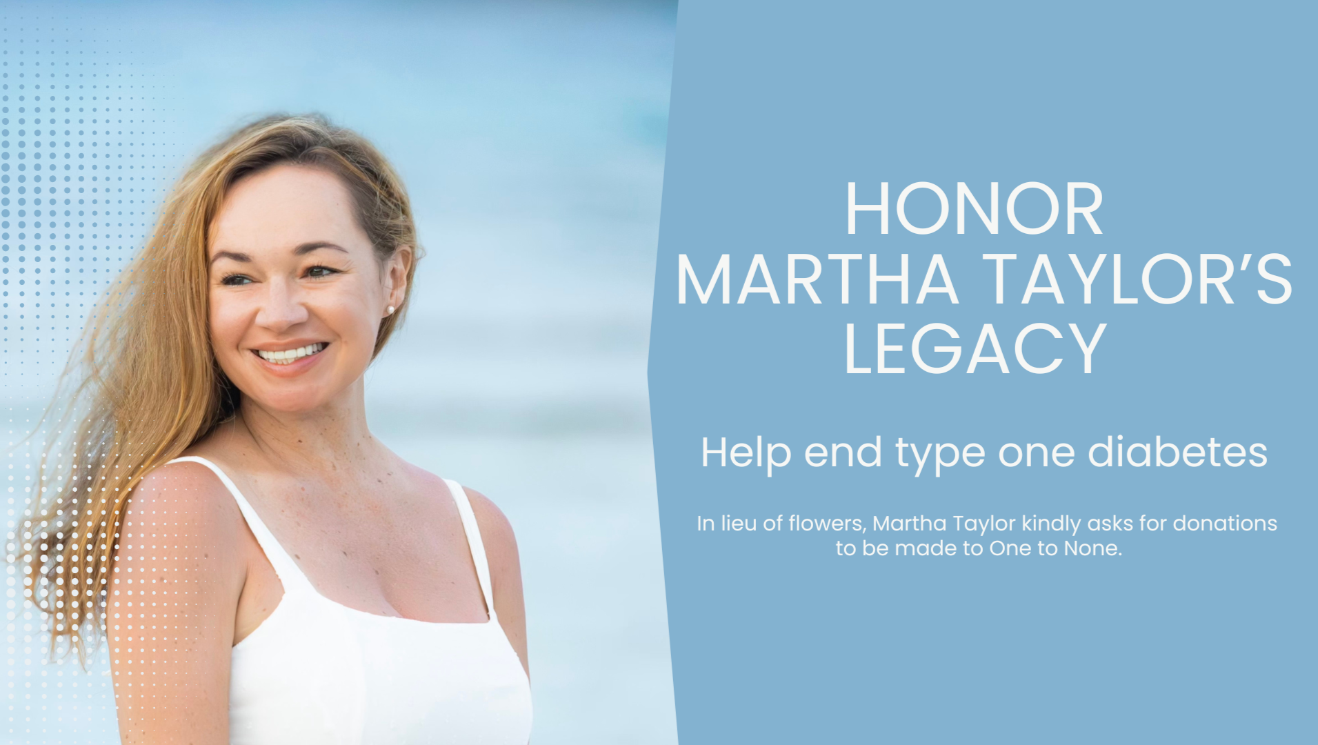 Martha Taylor was deeply committed to supporting Type 1 diabetes research and assistance. In 2018, she founded One to None, dedicated to raising funds for Type 1 diabetes research and providing financial assistance to those living with this chronic disease.