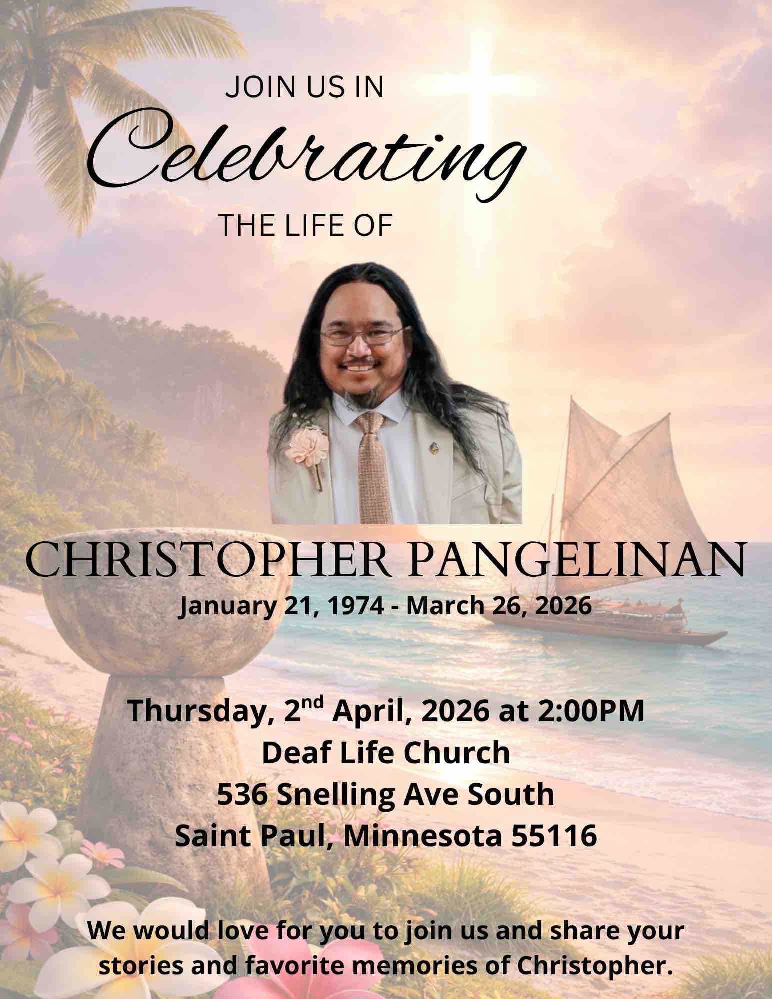 It is Chris’ wish that his urn to be brought back to his island, Guam, where he grew up. To honor Chris’ wish, the donations will help with travel and lodging costs for Stephanie and her daughter as well as to offset the funeral expenses. Additionally, your generosity will also help Stephanie and her family with meals while they go through the grief process. Every contribution, small or big will be very appreciated. Your donations also will help with travel and lodging expenses for Chris’ family who flew in from Guam and different States to see Chris before he passed away and for the funeral. We also would appreciate your prayers for the family during this difficult time.