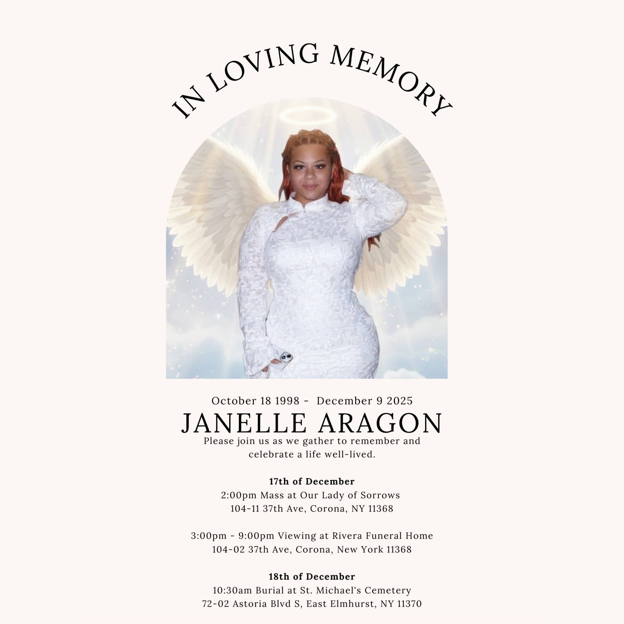 At this time, we are kindly asking for any donations to help cover funeral and burial expenses, so we can give Janelle the loving farewell she deserves. No amount is too small and every contribution will bring comfort and support to her grieving family during this unimaginably difficult time.