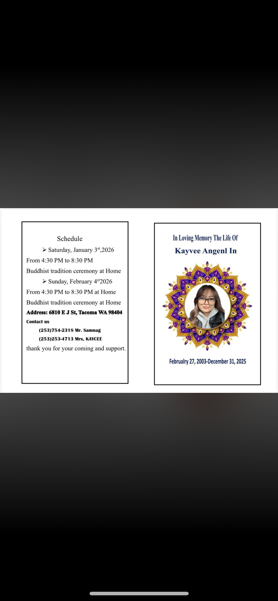 It is with heavy hearts that we share the news of the sudden passing of our beloved Kayvee Angel In on New Year’s Eve 2025. Kayvee was a cherished daughter, granddaughter, niece, cousin, girlfriend, and a loyal friend to so many. The joy, laughter, and unconditional love she brought into this world were truly endless. At only 22 years old, she was taken from us far too soon, but the impact she made in her years will last a lifetime. We will carry her spirit with us, keeping her in our hearts and our thoughts forever.