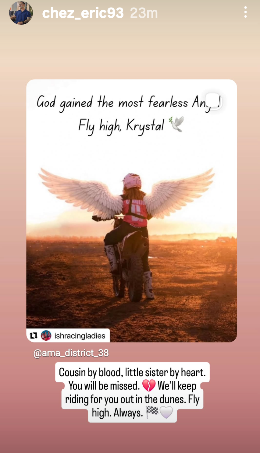 Hi my name is Irma I'm Krystal Carrillo Ramirez mom. Her racing family/friends would like for me to set this up for my daughter. The Lord needed this awesome, fierce less, most beautiful person. I lost my daughter Saturday at a racing event with District 38. She would always tell me mom if I die racing, I'm going to go very happy. I love racing it's my passion please don't take it away. I want to thank everyone for their prayers and all the wonderful words about my daughter. Her smile and dimples where amazing. I will for ever love her sincuenta.