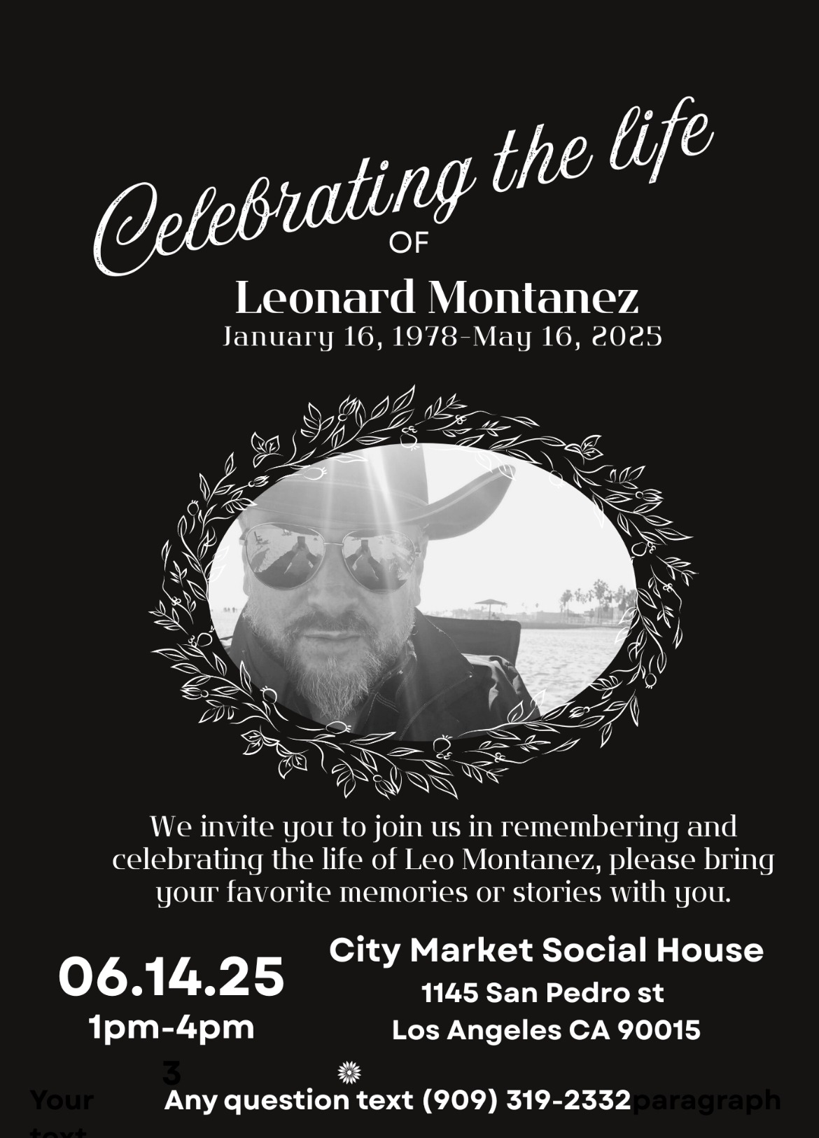 Celebration of Life will be held June 14th 1-4PM City Market Social House – 1145 San Pedro St., Los Angeles CA 90015