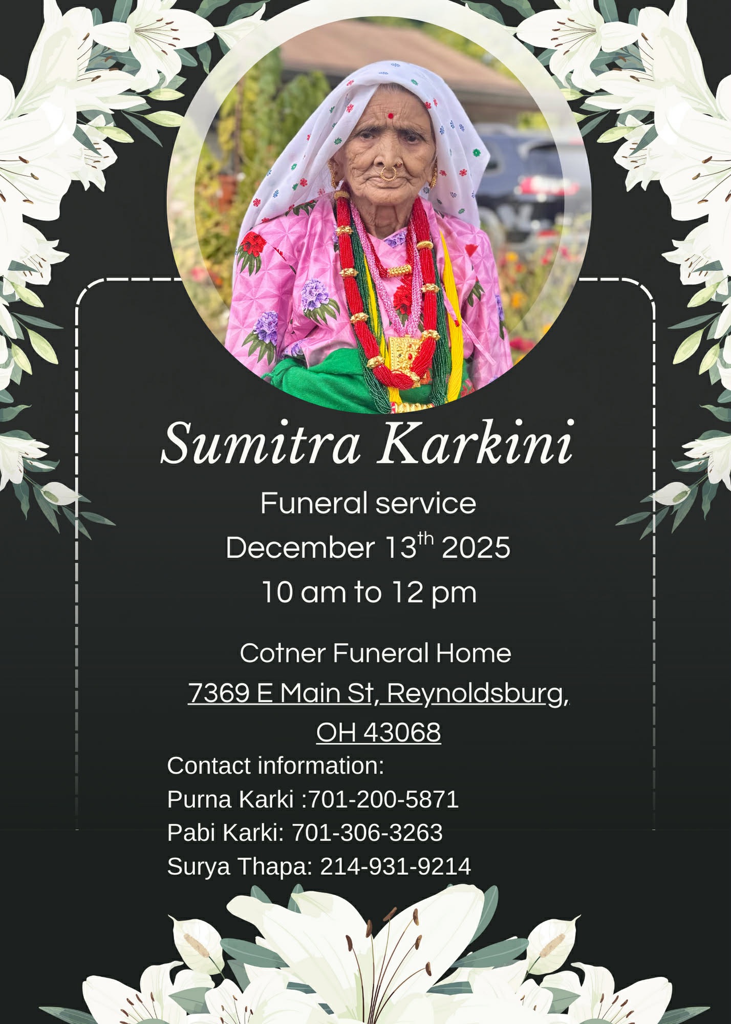 It is with great sadness that we announce the passing of Sumitra Karki, who left us on December 12, 2025, at 5:45 AM, surrounded by her loving family.