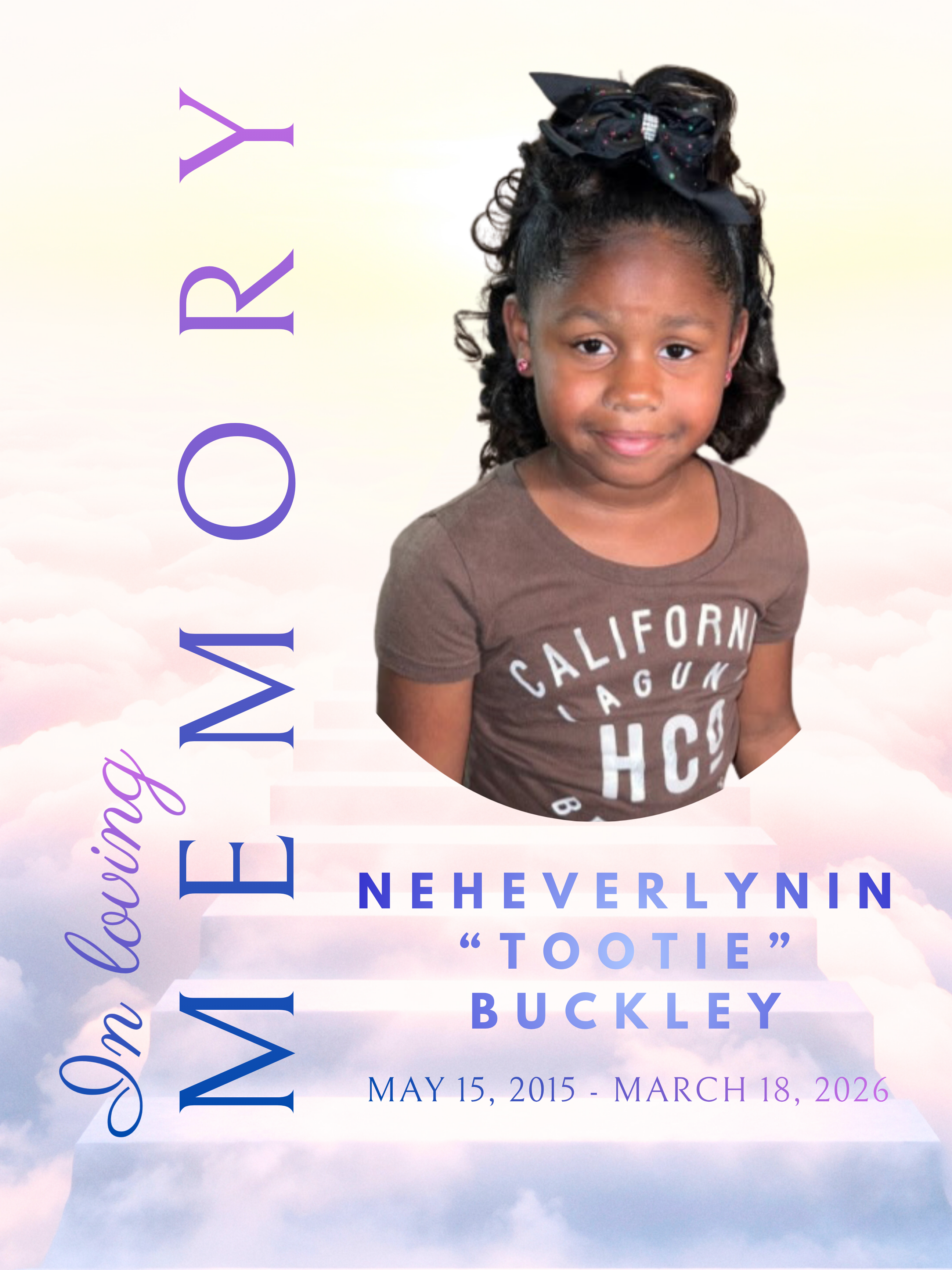 On Wednesday, March 18, 2026, the world lost a truly beautiful soul. Our special little friend, Neheverlynin Buckley—affectionately known to us all as "Tootie"—has put on her wings and is now resting peacefully in the arms of Jesus.