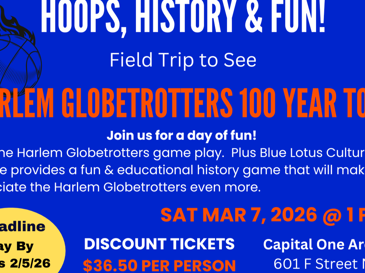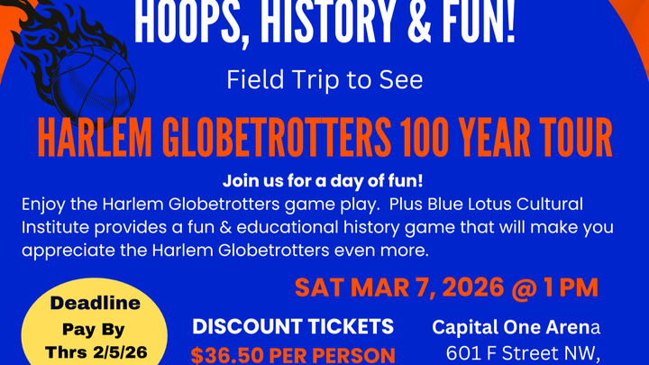 Hoops, History, and Fun! Help us create lasting memories of history and fun for our youth, family, and community. Donate $36.50 per person for the Harlem Globetrotters 100 Year Tour field trip on Sat, March 7, 2026 at the Capital One Arena, Washington, DC. Attendees will enjoy the Harlem Globetrotters game play. Plus, Blue Lotus Cultural Institute will provide a fun & educational history game that will make you appreciate the Harlem Globetrotters even more.