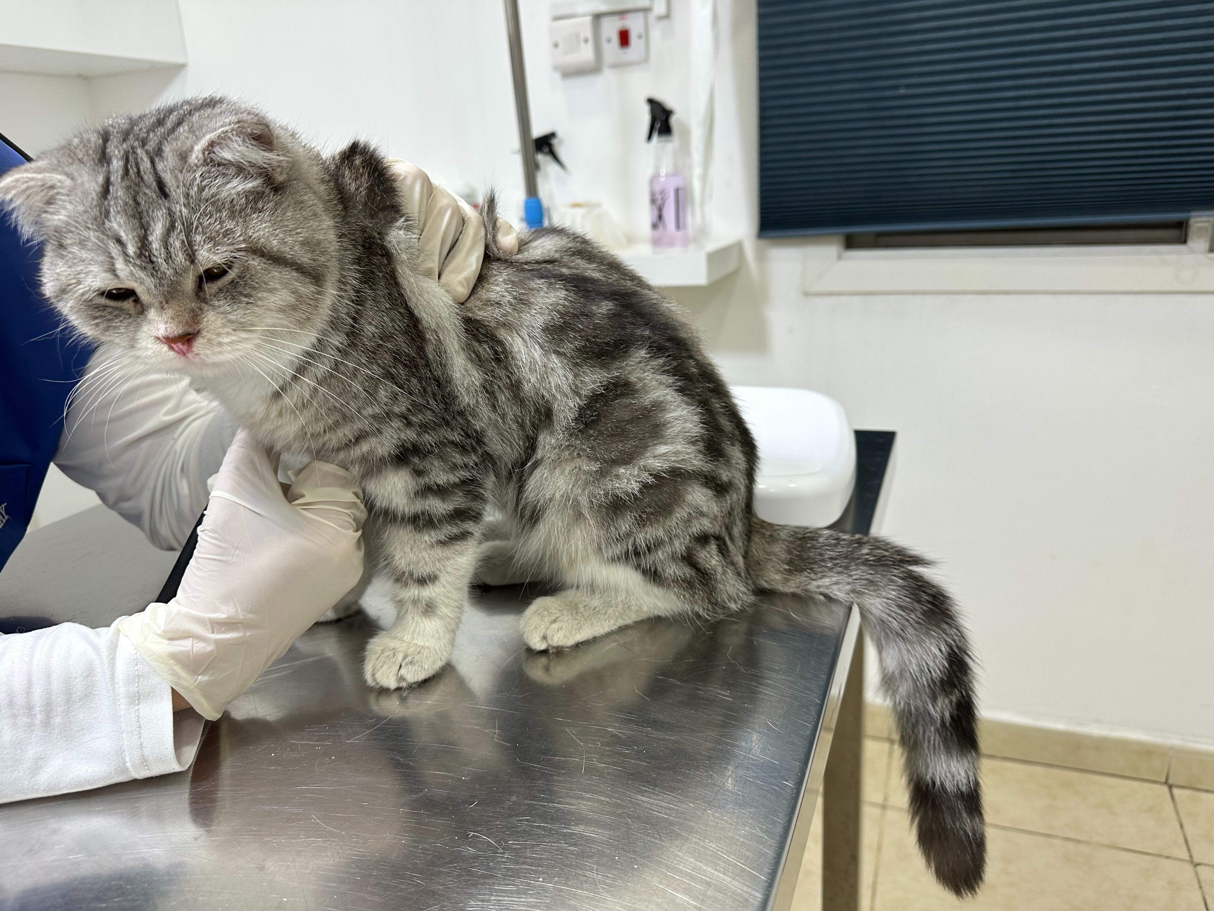 Skye, F 12-18m Silver tabby Scottish Fold. Skye was spotted in a very built up suburb by a food delivery driver – she was hiding under his bike terrified. He moved her to his building’s basement car park and posted on social media, which I was tagged on. Skye was off the streets with two days and is a super sweet and affectionate cat.