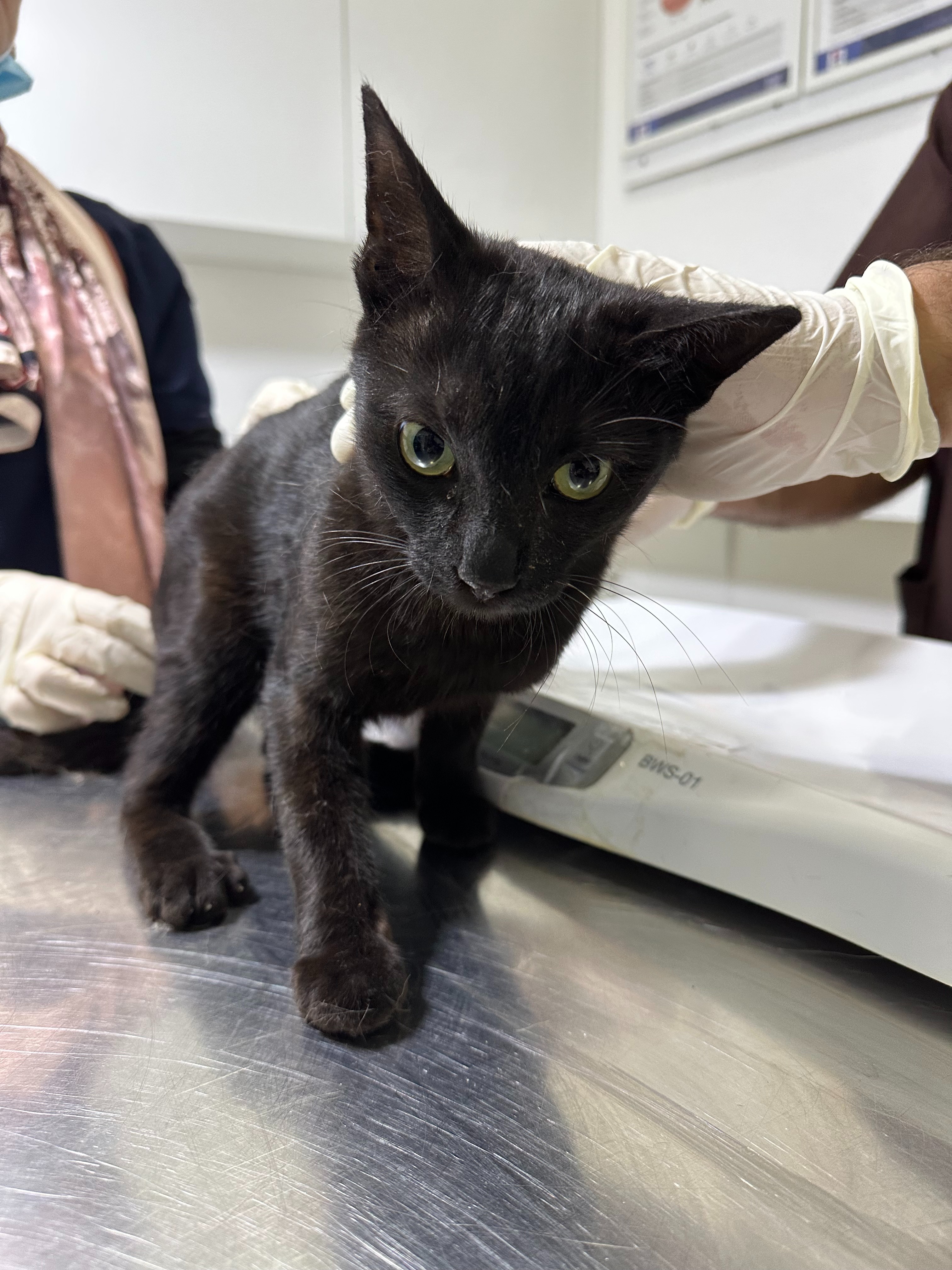 Mira (was Zohra), F 6m, Black Arabian Mau/Street cat. Mira approached me as I was walking back from my metro station just before the conflict started. She was asking for help. After initial vet check-up, I was referred to a special orthopaedic vet. She had multiple issues as a result of being hit by a car, we think: Hernia, blocked colon, broken left hip, crushed right hip/pelvis. She required two major surgeries, the second is rare, complex and risky, but the vet has given her a good prognosis if successful, offering a substantially discounted cost (£1900). He is fully committed and very interested in her case. Mira would have died if her treatment had not proceeded. The conflict has delayed her second surgery, and her stay in hospital has been extended as a result - but she is doing well. Mira is extremely friendly, sweet and affectionate cat. Available for adoption.