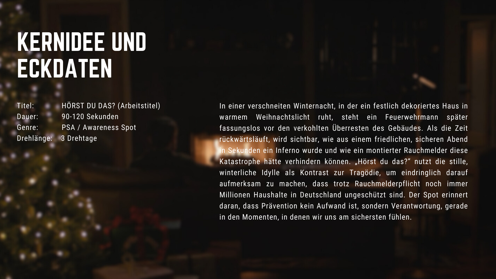 In einer verschneiten Winternacht steht ein Feuerwehrmann vor den verkohlten Überresten eines festlich geschmückten Hauses. Die Zeit beginnt rückwärts zu laufen und zeigt, wie aus einem ruhigen, sicheren Abend innerhalb weniger Sekunden eine Katastrophe wurde und wie ein funktionierender Rauchmelder all das hätte verhindern können.