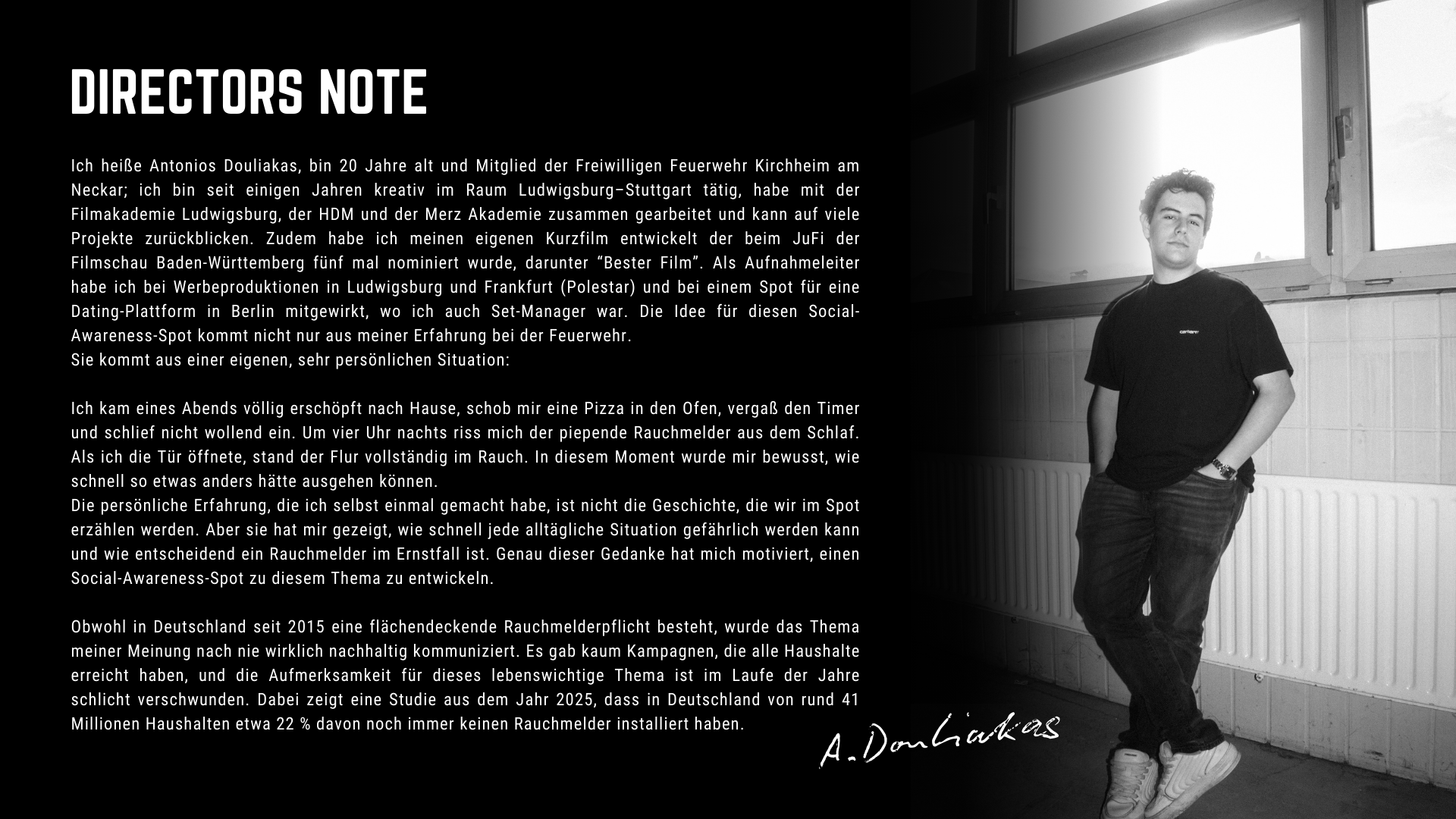 Der Initiator und Regisseur des Projekts, Antonios Douliakas, ist selbst Mitglied der Freiwilligen Feuerwehr. Die Motivation für diesen Film kommt nicht nur aus der Feuerwehrarbeit, sondern auch aus einer eigenen Erfahrung, bei der ein Rauchmelder rechtzeitig vor einer gefährlichen Situation gewarnt hat.