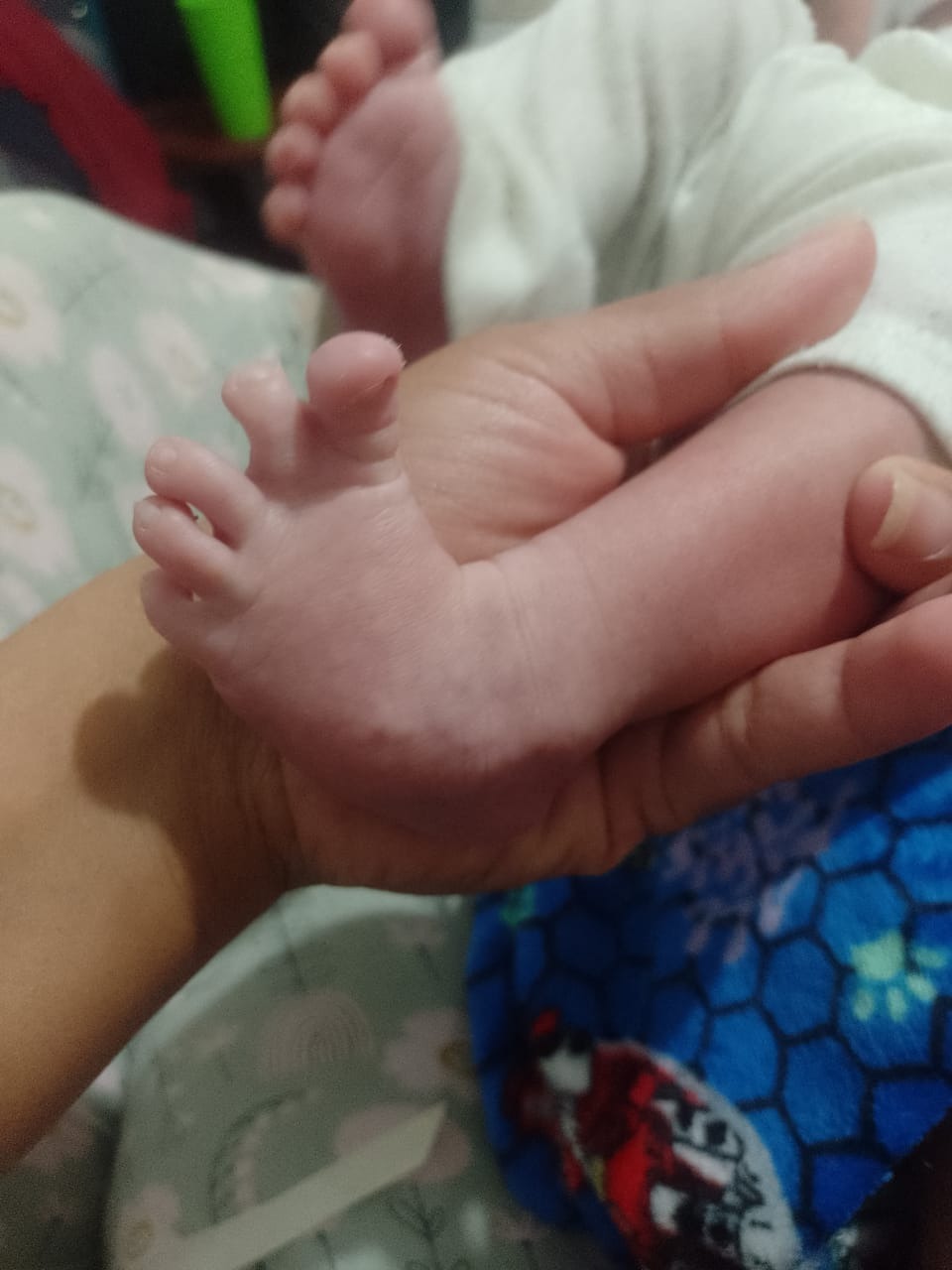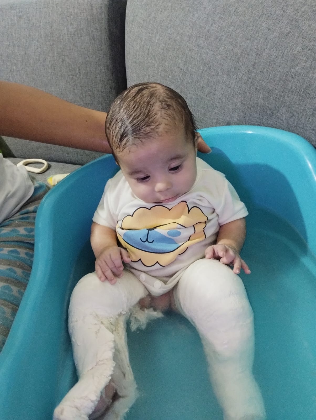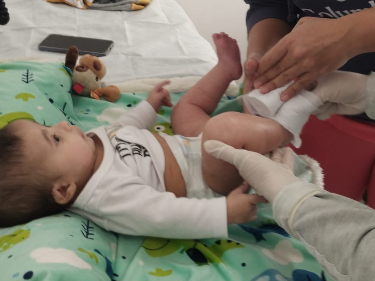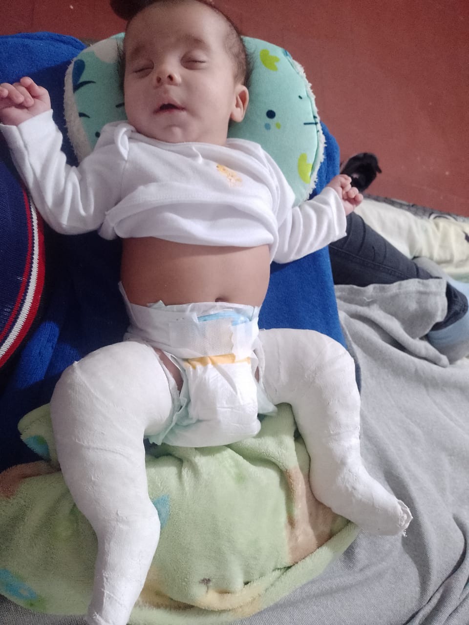 Lamentablemente además de todo esto, cuenta con una hernia inguinal, tiene solo un testículo, nació así... y a raíz de la patología de los piecitos, los deditos están pegados.