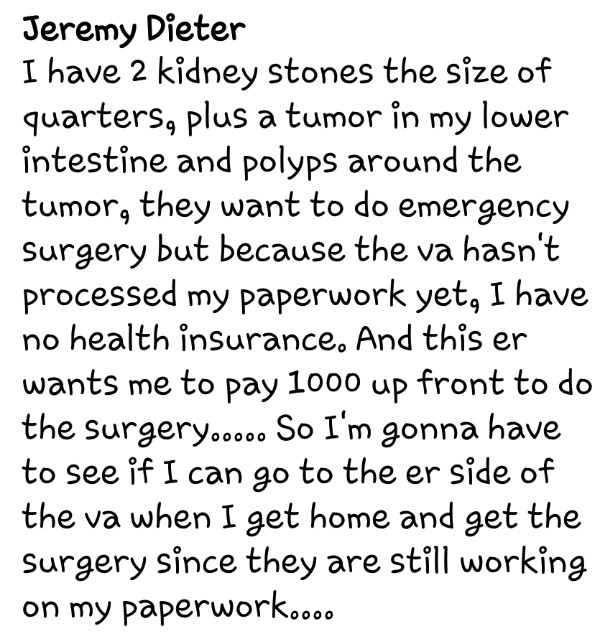Now, Jeremy is fighting for his life, begging for surgery! The VA has been stalling the process, which led Jeremy to seek care at local emergency rooms. None would do the needed surgery without $$1000-$1,500.