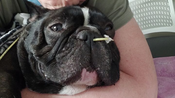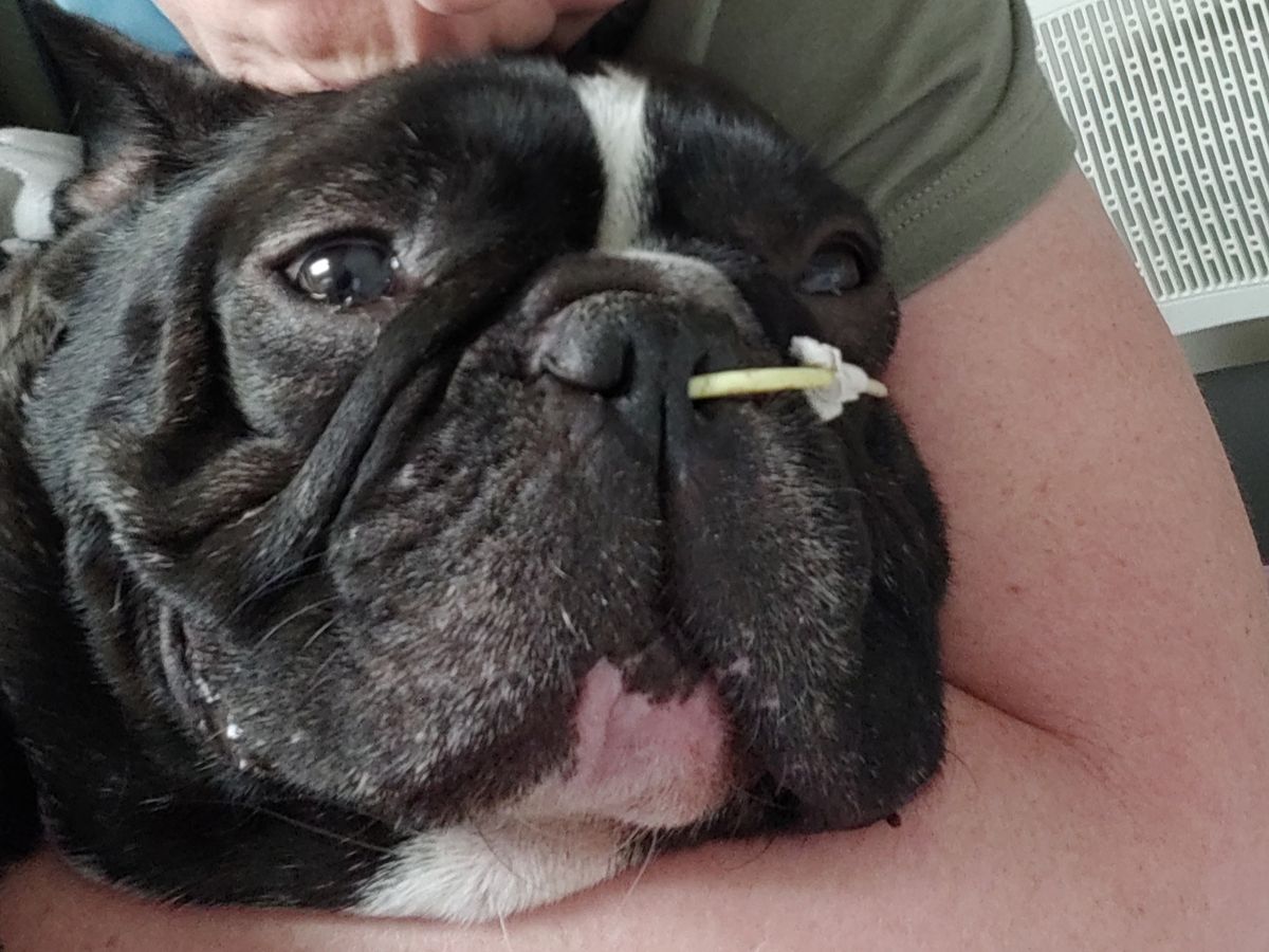 Finally, Hugo was out, had survived the surgery and was resting. The next 72 hours were touch and go. Hugo was regurgitating alot of fluid which was to be expected from a bracycephalic breed. We were informed that the vet had removed approximately 4 inches from his intestine that was black and blue from the object (strange rubber washer we'd never seen before. Possibly found outdoors 2"x2")passing through because of all the prior, unnecessary procedures done by our trusted vet. Hugo rested and was cared for in recovery for Friday and Saturday. We were informed Saturday that the regurgitation was still an issue but wasn't as important as it was getting him to eat. We visited Saturday morning and afternoon with a home cooked meal of finely chopped chicken and rice (as requested by the vet). Hugo refused to eat. He slept face first in his empty water bowl only wanting to drink and protesting food in his stubborn Frenchie way lol. We cuddled and continuously attempted to feed him with no luck. We continued through Saturday into Sunday with no avail. We returned Sunday morning to find out Hugo has eaten for one of the staff and was able to be discharged home. We were ecstatic to say the least! We had all of our meds and instructions and off we went. Sunday evening, Hugo was happy to be home with his family, carried his bone everywhere, shook his bum, happy and content but again refusing food. We assumed it could be the excitement of returning home and let him relax and sleep the night away. Upon waking Monday morning and expecting Hugo to want to get up, toilet and eat we were shocked to see that he refused to move, lethargic, his eyes glossy and watering, When he did barely get up to drink, he regurgitated everything including the whole food from the night before. We immediately returned to the emergency animal hospital. We were given an script for another medication to help with the motility of the intestines and returned home. Hugo rested and was up, once again regurgitating and vomitting but now blood. We were terrified. Rushed back to the ER vet and were told we'd need to hospitalize Hugo for observation.