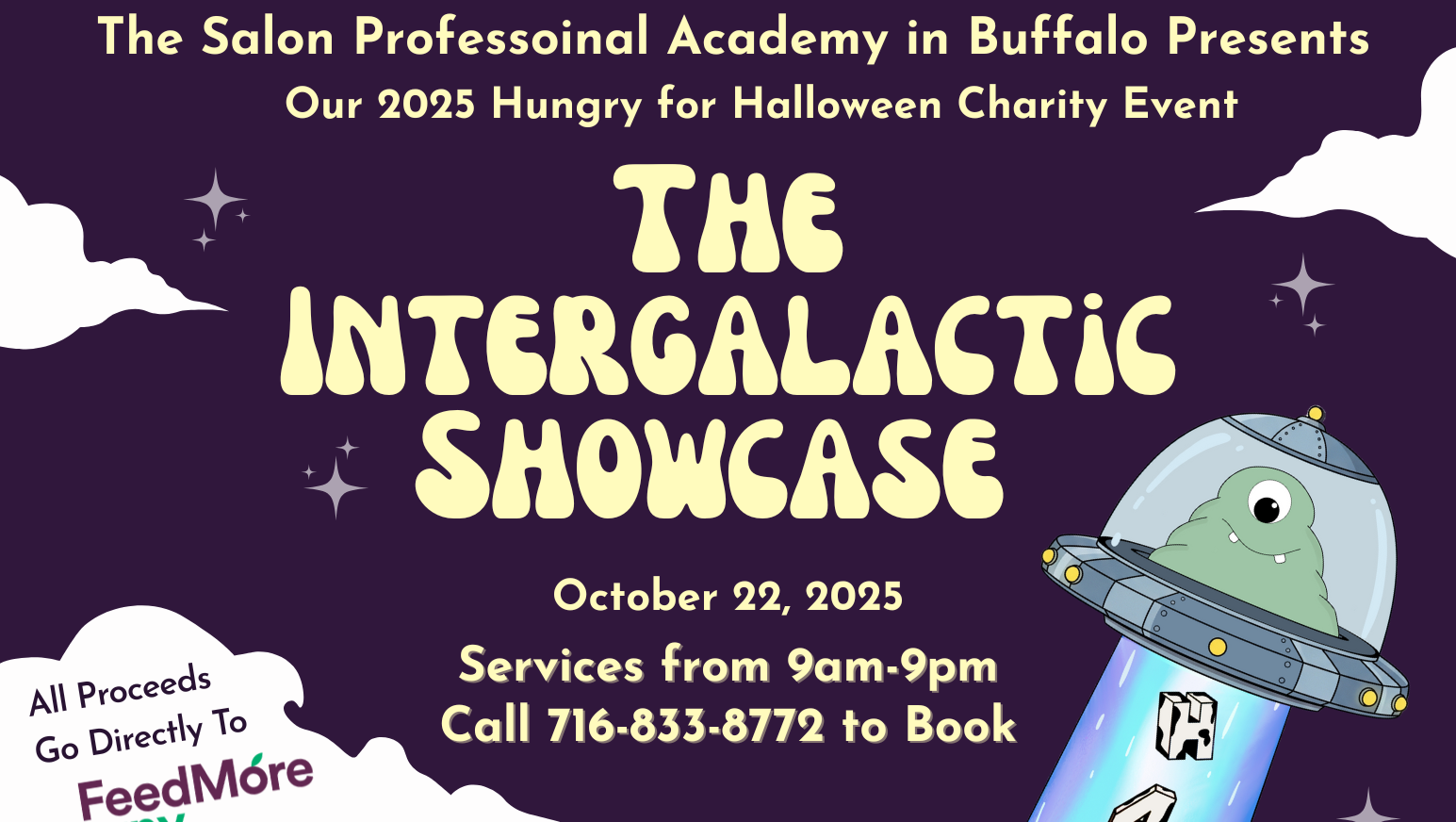 At The Salon Professional Academy in Tonawanda NY we believe that looking and feeling your best starts with doing your best. Our 5th annual Hungry 4 Halloween event is a great opportunity to give back to our community by raising money for FeedMore WNY while teaching our students the importance of making a difference in the lives of others. Our students, educators and alumni join forces to provide hair, skin and nail services to the public for $10-$40 while offering additional fun for our guests to take advantage of. The Hungry 4 Halloween event kicks off a month long food drive and silent basket auction and all proceeds go directly to FeedMore WNY. Help us reach our goal of $5000 by joining us on 10/22/2025 for services at The Salon Professional Academy located at 2309 Eggert Rd, Tonawanda NY or stop in anytime throughout the month to drop off food, or join in on the fundraising fun.
