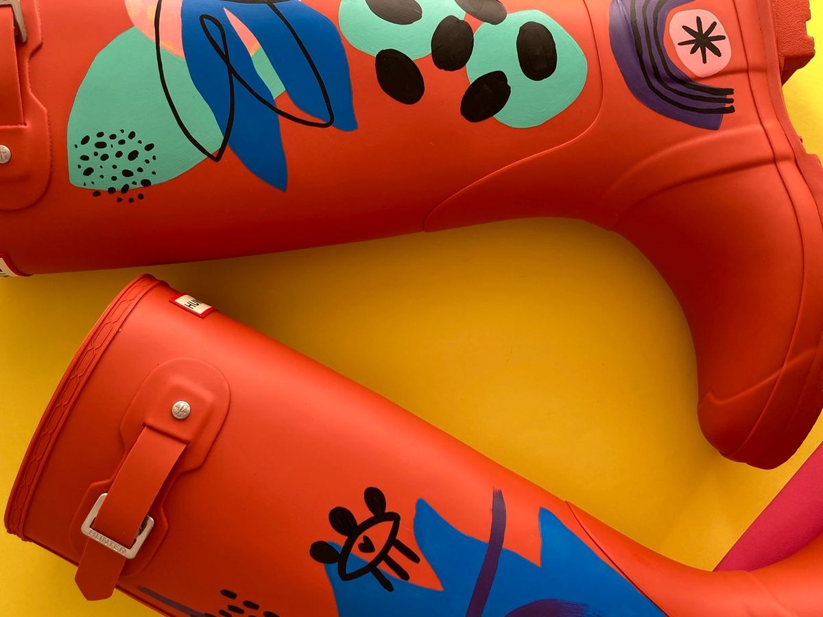 A marca ofereceu dois pares das suas botas mais icónicas, as Original Tall - uma no número 38 e uma no número 39 - e a artista ofereceu o seu talento ao personalizar os dois pares com elementos do seu mundo imaginário, criativo e colorido. O resultado são duas botas de borracha únicas e originais, completamente preparadas para enfrentar os dias de chuva e lama com o maior estilo. No tom salmão, com personalização à prova de água em ambos os pés, na parte exterior.