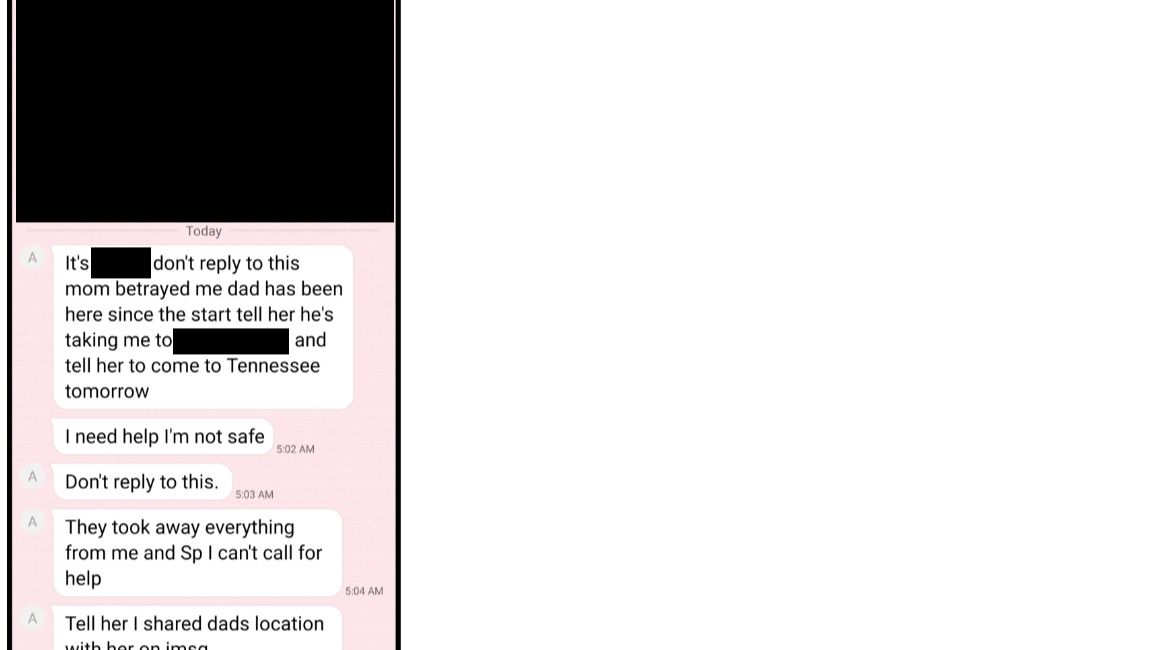 My neice was able to sneak her Dad's phone long enough to get this message to me. She is asking me to help her by letting her sister (through me) know she needed help. She quickly deleted this message.