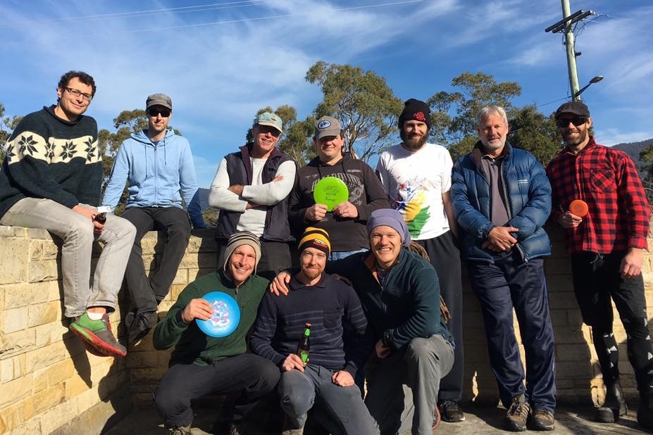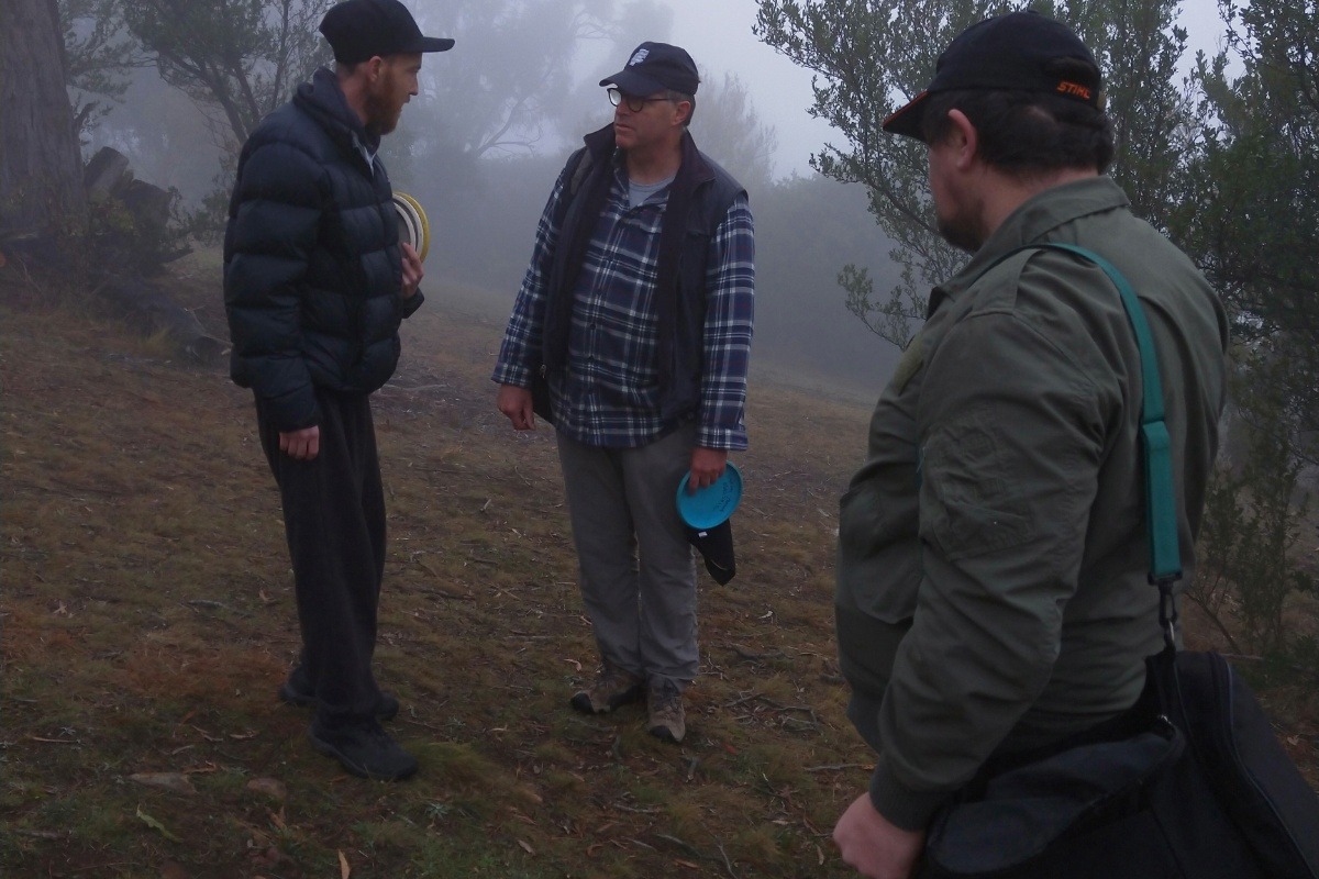 Iain, Harvey Yarnall and Damien Williams. Hobart Disc Golf League Day 7 July 2019. Although Iain was too unwell to play he still carried his discs with him.