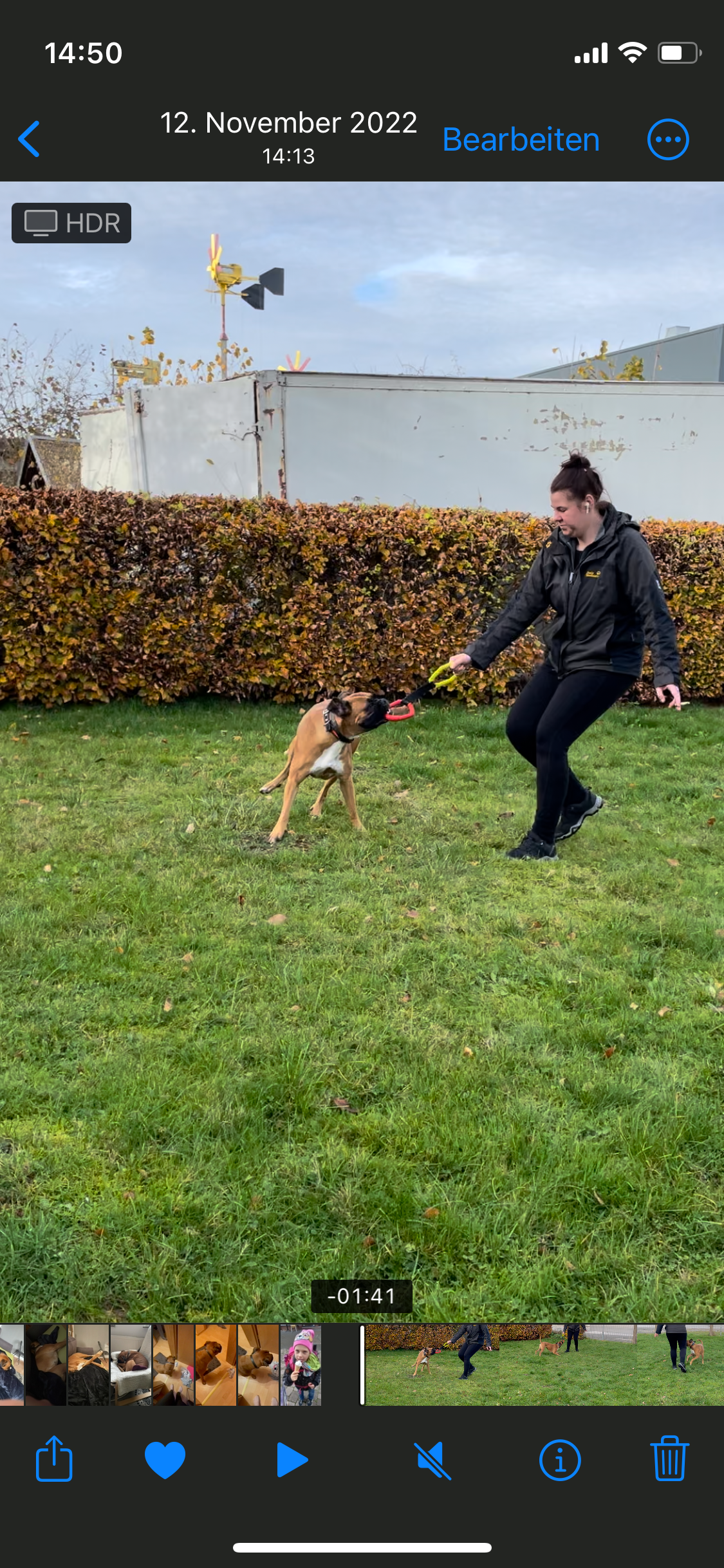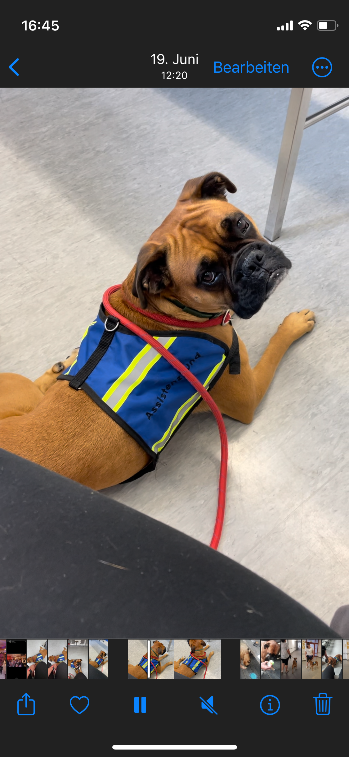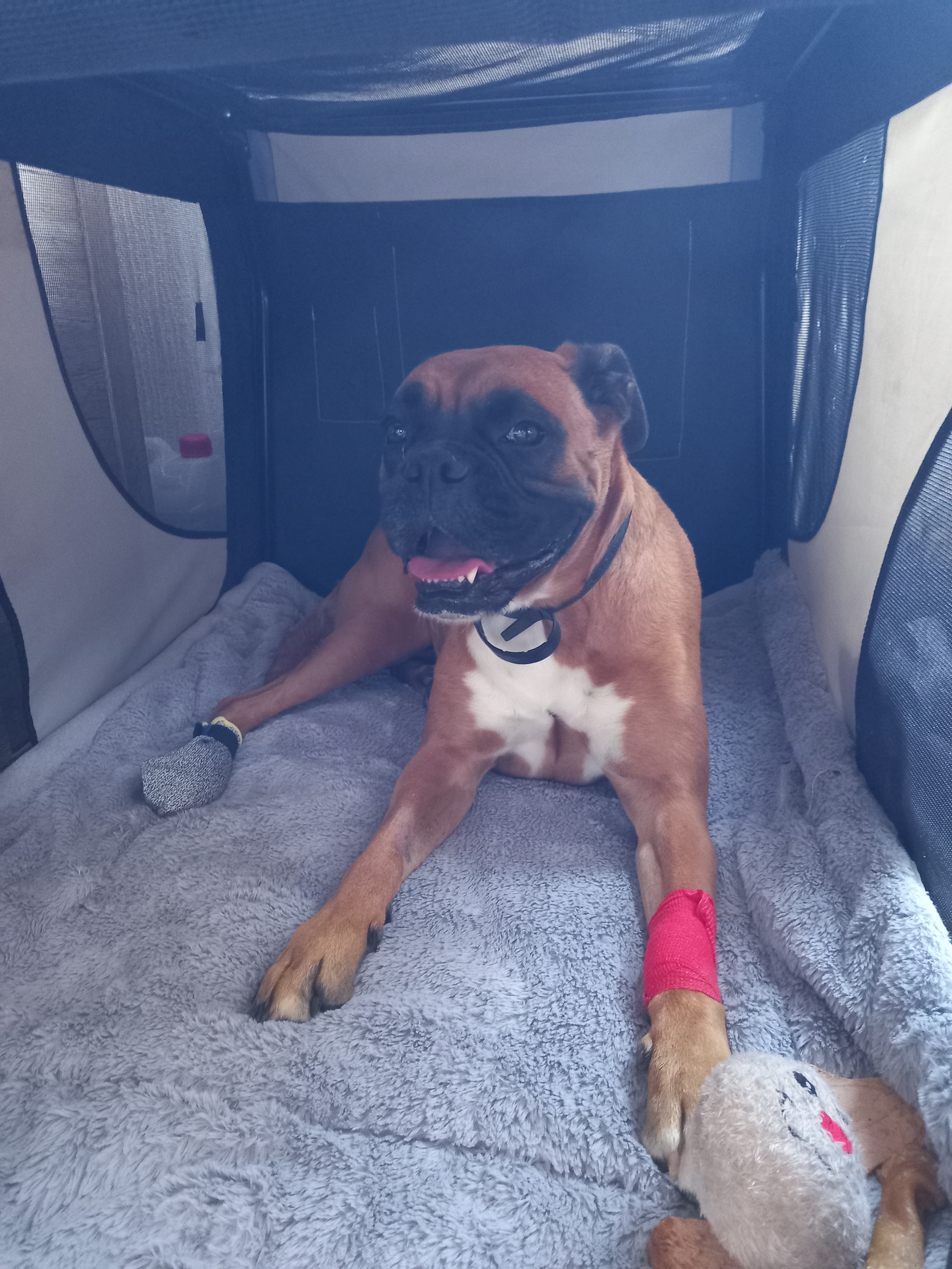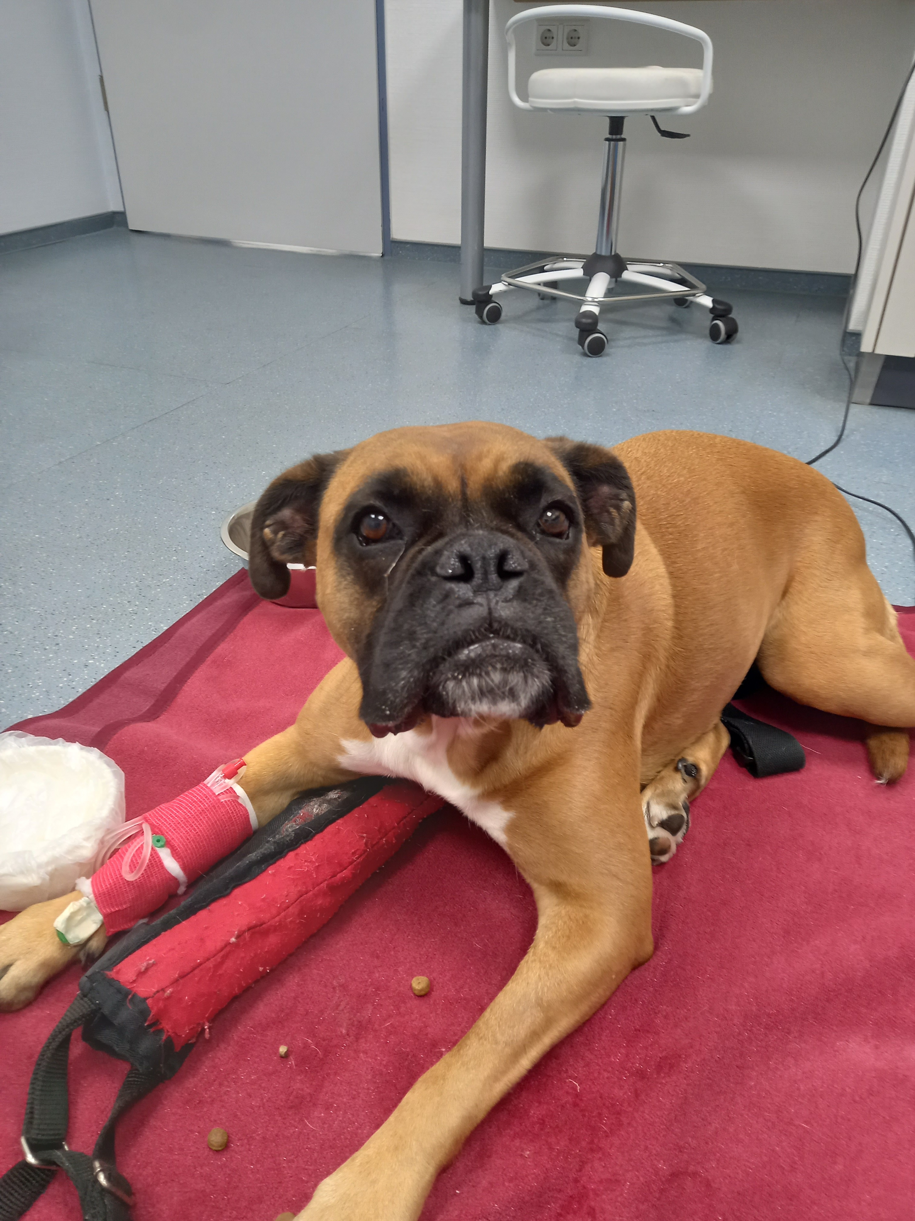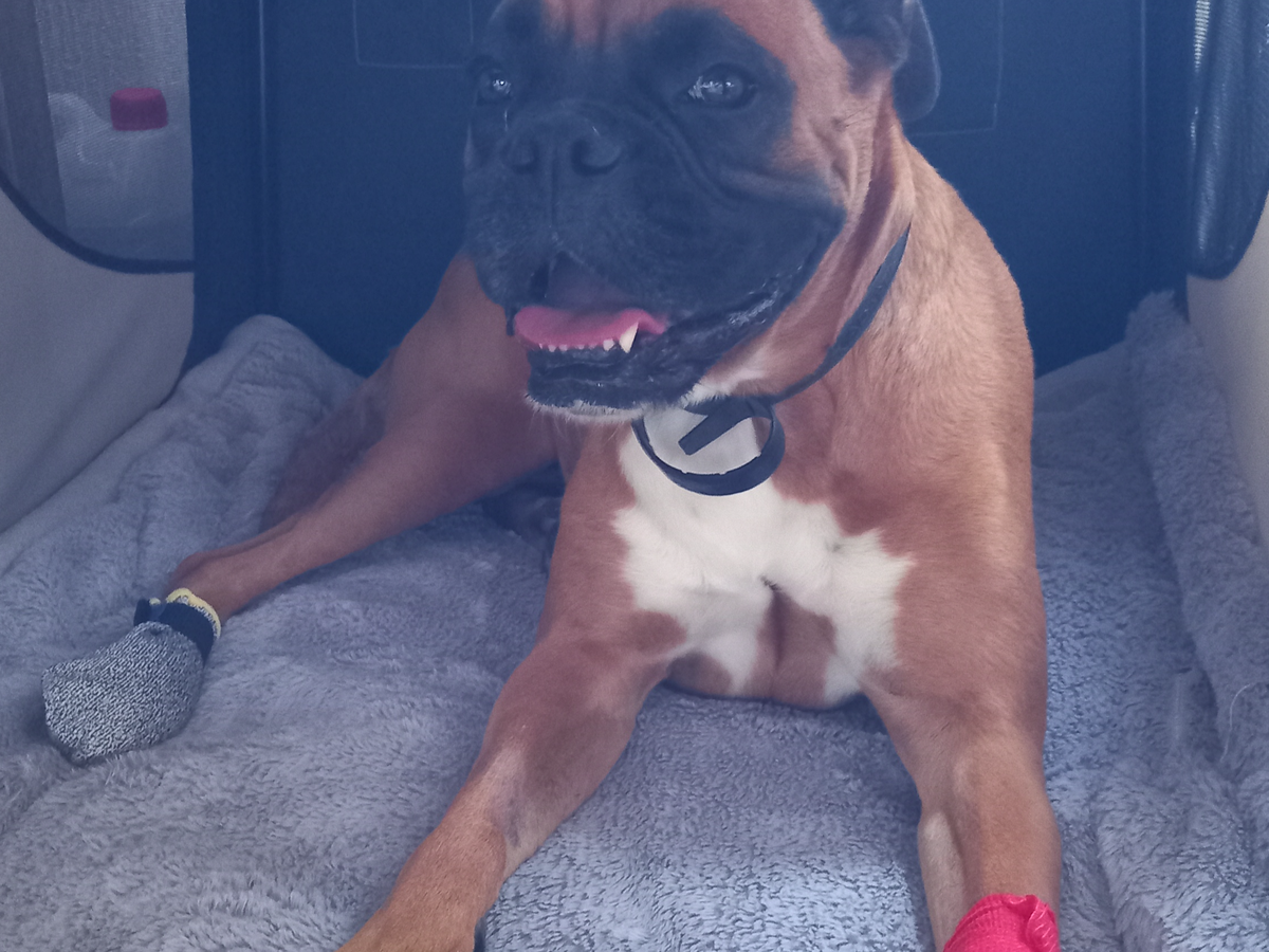 Mein Name ist Nami. Ich bin eine 4 Jahre alte Boxerhündin und ich hab soooo viel Hummeln im Hintern...nur leider habe ich mir am 19.7.25 eine ganz blöde Verletzung zugezogen. Mir ist nämlich eine Bandscheibe raus- und wieder rein gerutscht und hat mein rechtes Hinterbein gelähmt. Und Leute, das tat so unglaublich weh. Zum Glück war mein Frauchen sofort da und hat mich beruhigt und wir sind sofort zum nächsten Tierarzt gefahren. Aber das ganze tat so weh und hat mich so doll gestresst, dass es mir immer schlechter ging und ich am ganzen Körper Krämpfe bekommen habe. Mein Frauchen hat ganz doll geweint, aber ich konnte sie gar nicht trösten. Das ist nämlich mein Beruf. Ich bin nämlich der Assistenzhund von meinem Frauchen.
