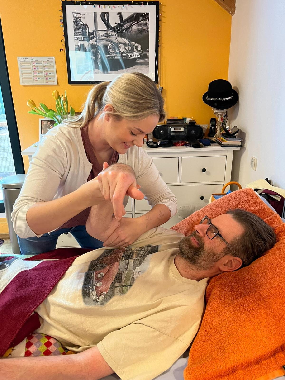 Im November 2026 kam Vanessa, meine mobile Physiotherapeutin. Sie kommt drei bis vier Mal pro Woche, arbeitet unermüdlich mit mir, um mir Kraft und Beweglichkeit zurückzugeben. Doch so sehr wir uns bemühen: die größte Barriere bleibt die Mobilität nach draußen.