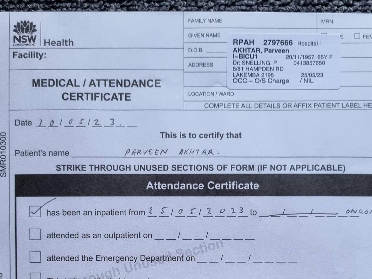 Dear brothers and sisters my mother in law who came to Sydney ( Australia ) for a visit from Pakistan for the past 2 months. She and her husband had their tickets booked on 25th May 2023 but just a day before she was flying back she fell extremely sick with very bad liver infection and kidney failure she ended up in RPA hospital’s ICU in Sydney, in a very critical condition fighting for her life.