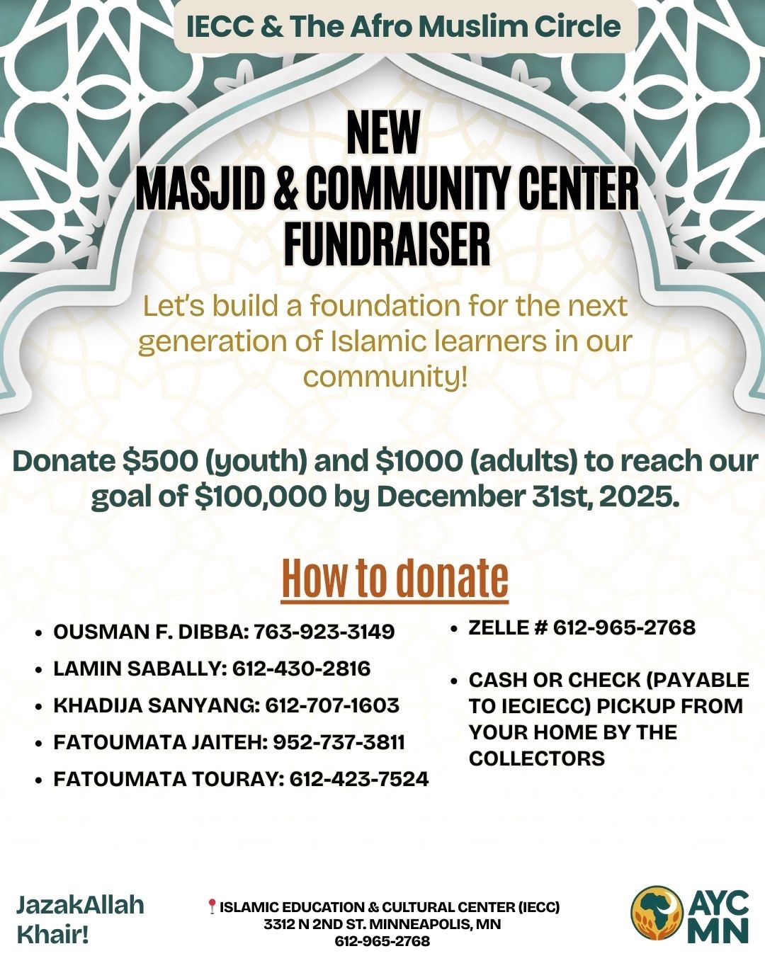 We are the Afro Muslim Youth Circle of Minnesota, reaching out to you with an important request and a heartfelt hope. Our current masjid (Islamic Education and Cultural Center (IECC), while cherished, no longer meets the growing needs of our community. As our numbers and programs expand, so does our need for a space that can truly serve us all spiritually, socially, and educationally.