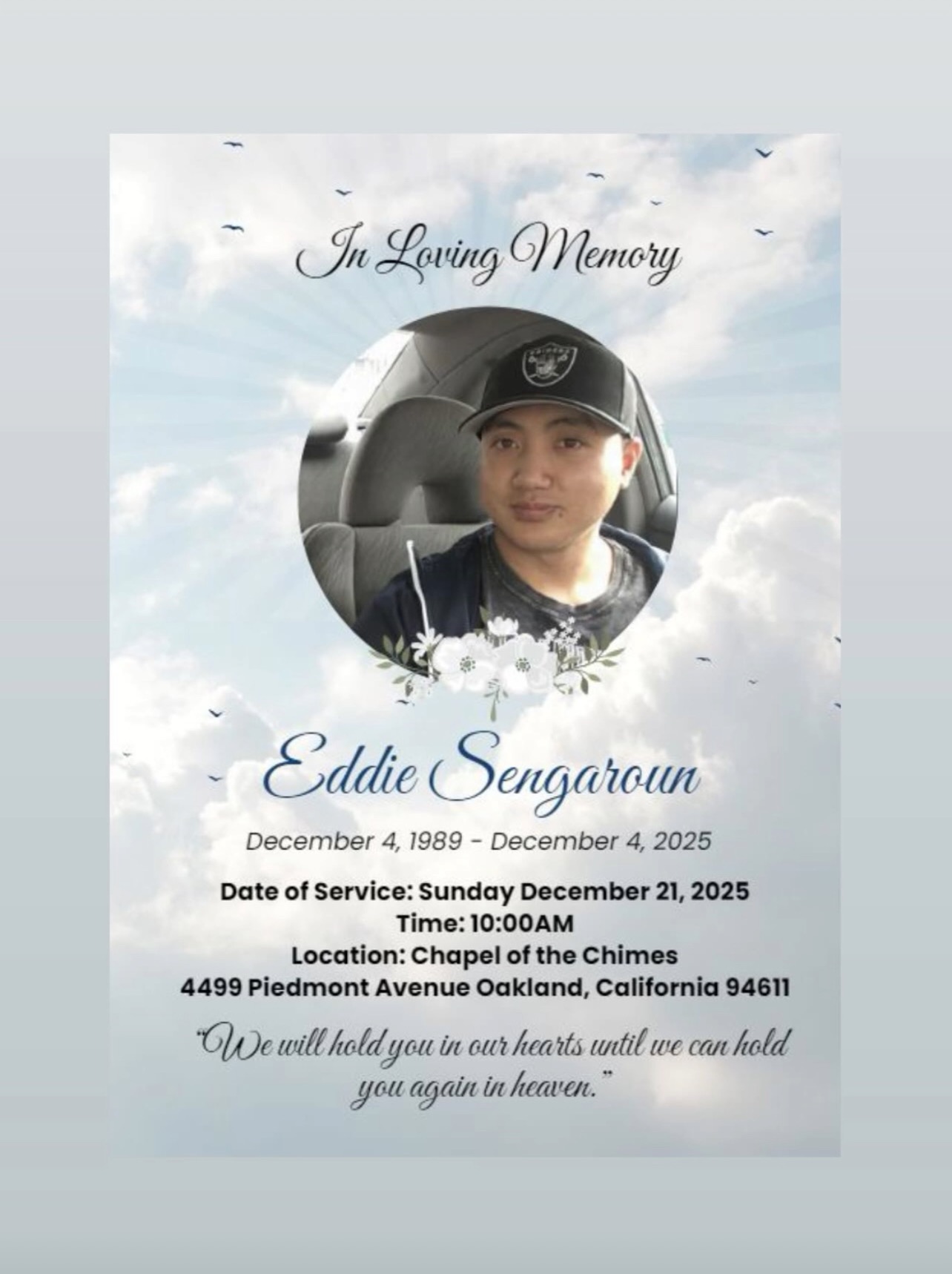 EDDIES SERVICE AND FUNERAL DATE IS DECEMBER 21ST AT 10AM