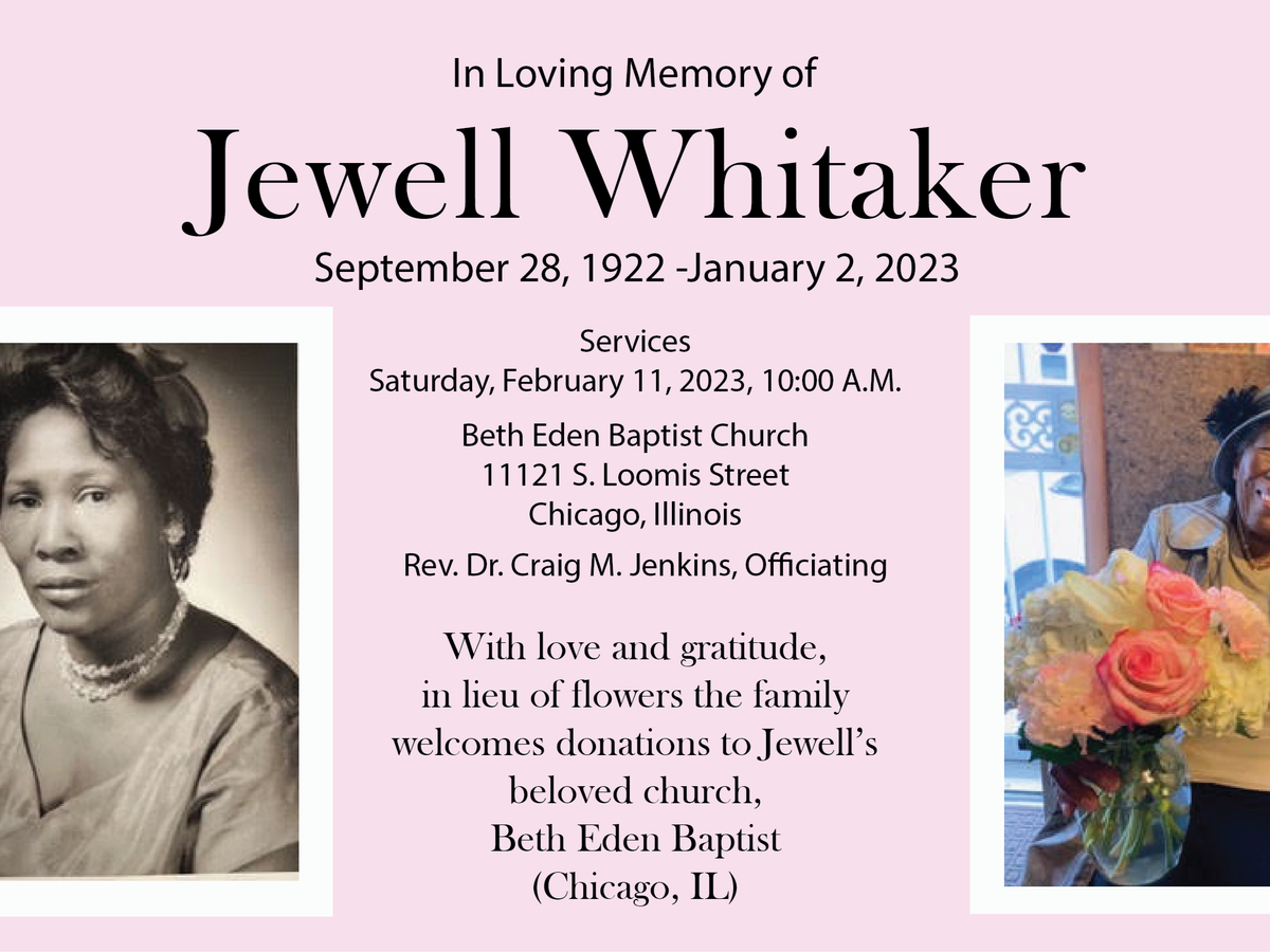 Jewell was especially passionate about helping her church, Beth Eden, with the building fund and the church ministries. In place of flowers, the family welcomes donations to her spiritual home, Beth Eden Baptist Church in Chicago Illinois, to honor her memory.