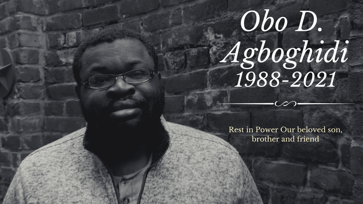 We are devastated by the loss of Obozokhale “Obo” Douglas Agboghidi. He was the kindest man with the sweetest soul. Those blessed with the opportunity to know him will never forget how thoughtful, considerate, sarcastic, and funny he was. His relaxed and calm demeanor sheltered a brilliant mind and artistic imagination. We will all dearly miss our loving son, selfless, sibling and loyal friend.