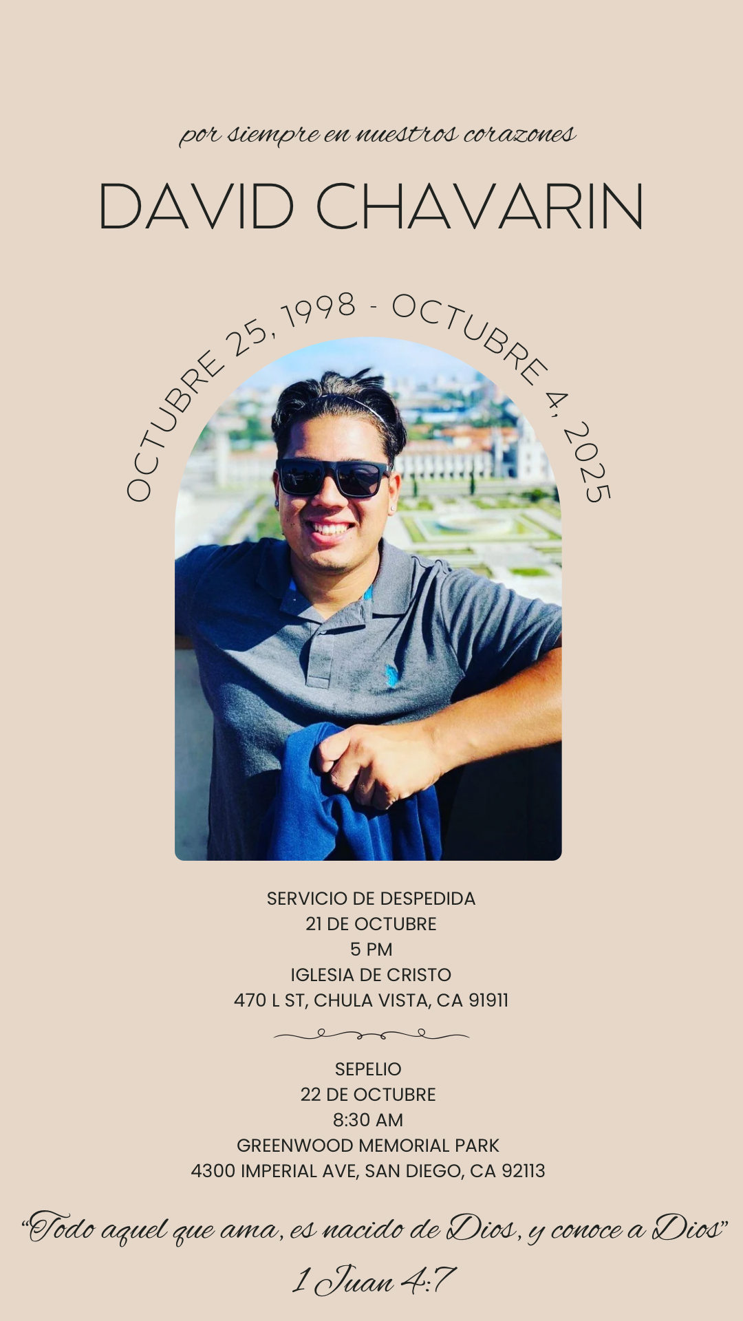Con el corazón destrozado, anunciamos la inesperada partida de nuestro David. Falleció el 4 de octubre del 2025, a la temprana edad de 26 años. David siempre fue una persona con un corazón enorme, siempre positivo, generoso, noble, chistoso, expresivo, y con muchas ganas de servir a todos los de su alrededor. David fue un hijo amoroso, hermano incondicional, amigo leal, tío y padrino ideal, y trabajador dedicado.