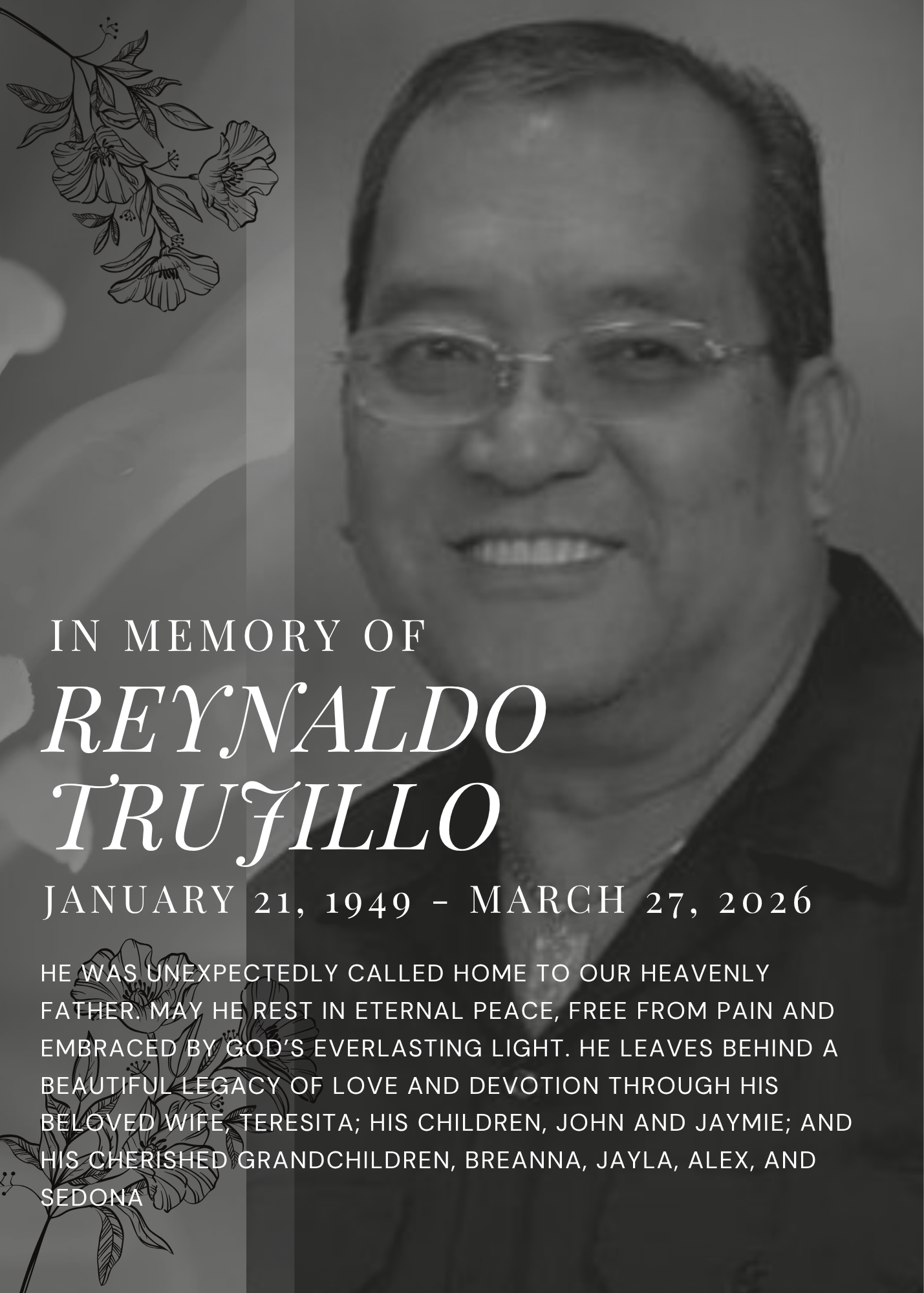Our hearts are heavy as we share the unexpected passing of our beloved Papa Rey. He was the kind of person who made everyone feel like family, with a loving, caring, and full of joy kind of way that was impossible to miss. Whether he was singing, dancing, or simply sharing a smile, he brought light into every room he entered.