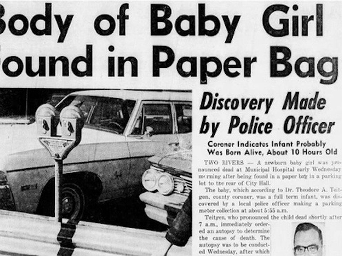 In March, 1970, a newborn baby girl was found in a bag in the parking lot of the Two Rivers city hall just before 6:00 A.M. The infant, which was full term, was taken to the hospital where it was pronounced dead. An autopsy done at that time indicated that the baby died of a combination of asphyxiation and exposure.