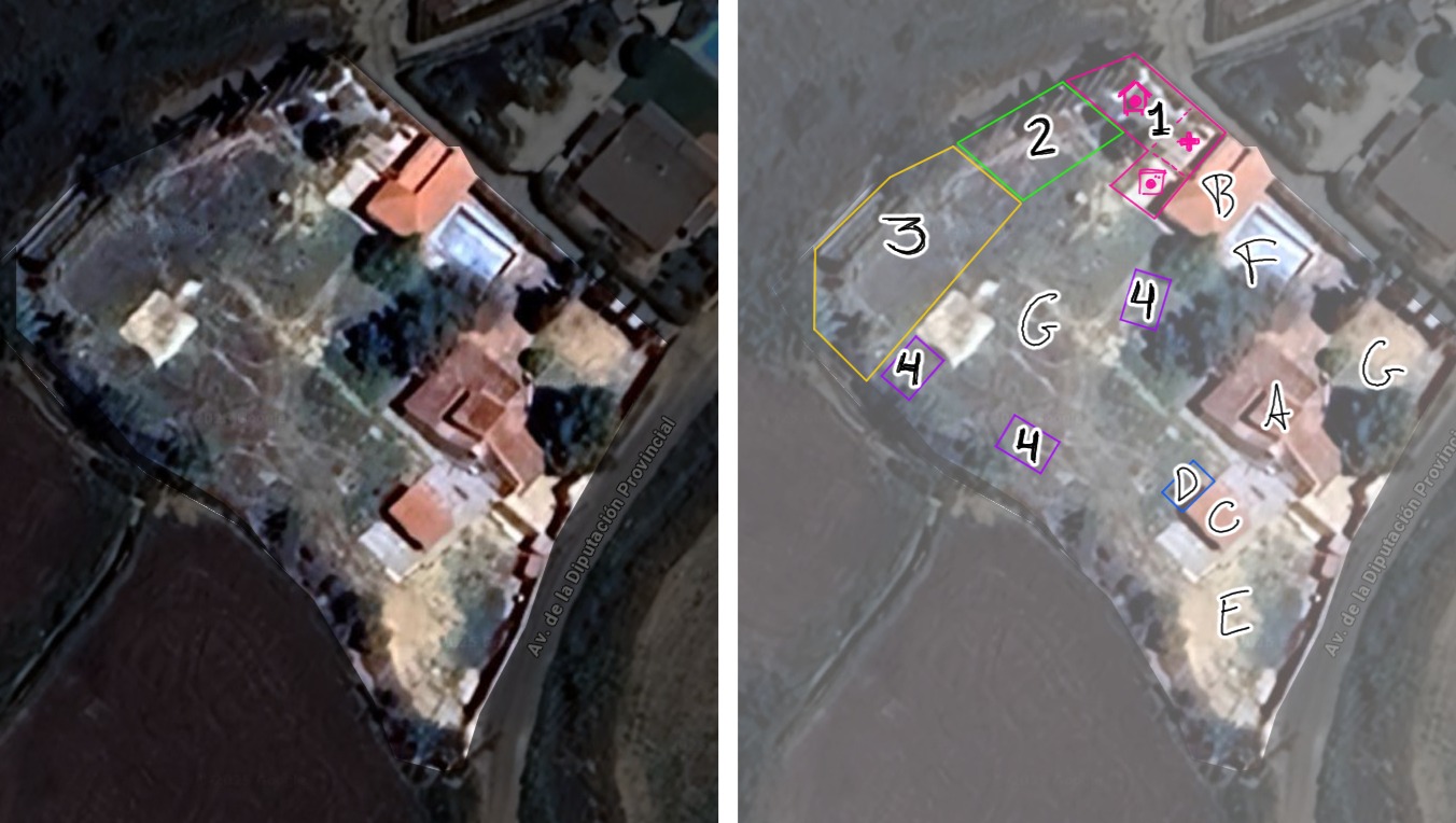 • A, B, C y D) Casa principal y dependencias.