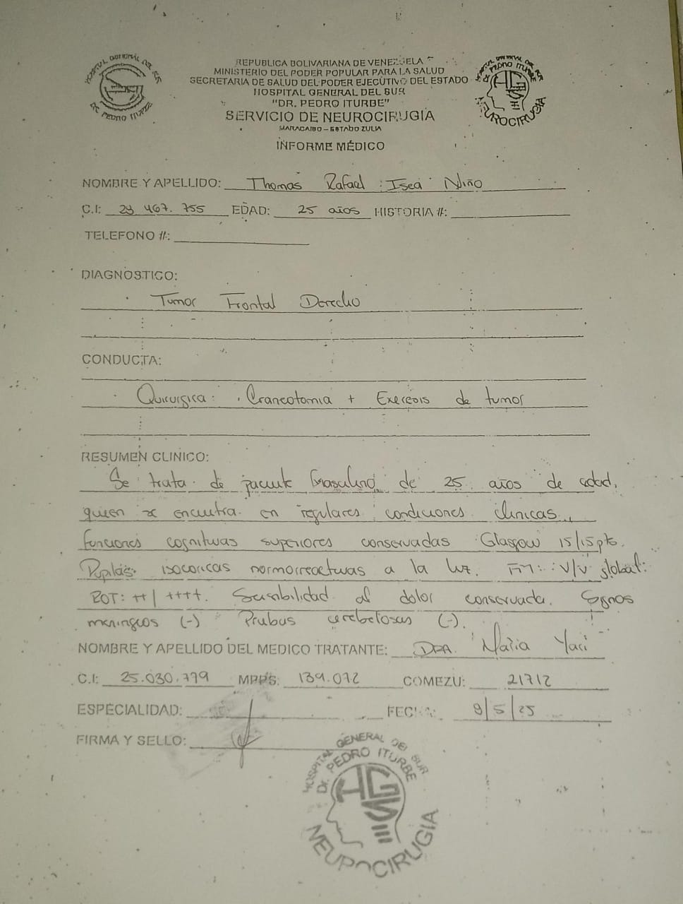 Hola me llamo Thomas Rafael Isea Niño tengo 25 años hace unos dias a causa de fuertes dolores de cabeza me realizaron unos estudios, en el cual los resultados fueron que padezco un tumor Frontal derecho en la cabeza. La cual necesito de una intervencion quirurgica de urgencia y junto a mi familia no contamos con fondos suficiente para esta. Con lo que puedan colaborar les estaremos agradecidos de corazón pero sobre todo le pido ayuda con sus oraciones.