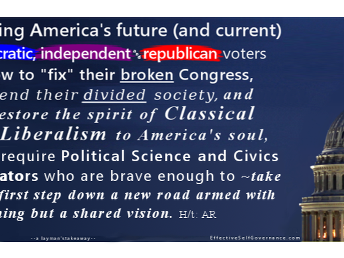 To take that next step, our political scientists will have to create a radically new academic discipline based on the concept of “effective” S-G—working title: the study of Effective Self-Governance Theories, Models and Strategies. Its major focus: teaching our left- and right-of-center (LOC/ROC) voters how to begin using a "normative" self-governance (S-G) "strategy" which will enable them to begin keeping their U.S. House and Senate continually replenished with a steady supply of a modern democracy's version of Philosopher Kings and Queens (PKQs).