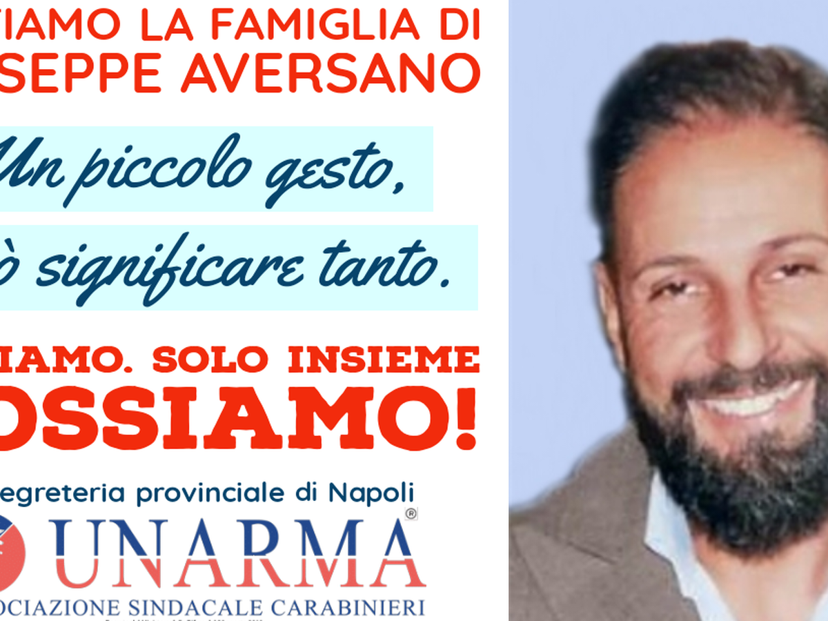 La segreteria UNARMA ASC di Napoli ha avviato una raccolta fondi a favore dei familiari del Brigadiere Aversano Giuseppe, prematuramente scomparso dopo aver lottato contro un brutto male che purtroppo ha avuto la meglio su di lui a soli 41 anni. Giuseppe e la sua famiglia hanno lottato con tutte le forze disponibili senza purtroppo riuscire a sconfiggere una rara e troppo aggressiva malattia (Sarcoma di Ewing). Giuseppe lascia il suo bene più prezioso, una moglie e due figli di 12 e 7 anni che ad oggi stanno vivendo un serio periodo di difficoltà economiche oltre a ritrovarsi a dover affrontare la vita senza il loro amato. La segreteria UNARMA ASC di Napoli pertanto ha deciso di farsi portavoce di una raccolta fondi che avverrà attraverso la piattaforma GoFoundMe a nome del Segretario Generale della città metropolitana di Napoli Claudio Cappiello.