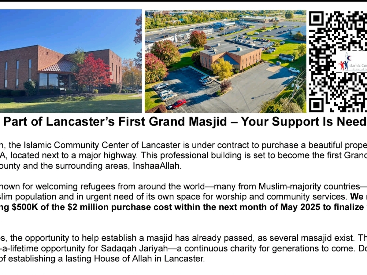 Islamic Community of Lancaster is excited and is in process of acquiring their first building for the community needs.