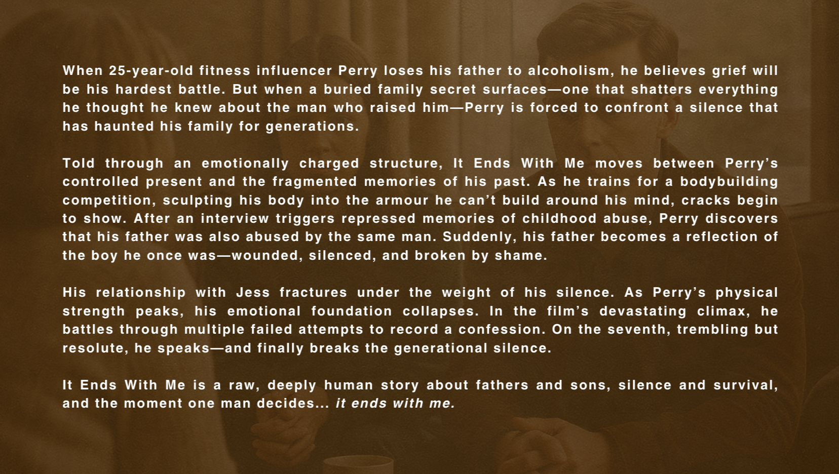 “When a fitness influencer's father drinks himself to death at 48, his quest to understand why unearths a family secret that will force him to choose between protecting his perfect life or breaking the silence that killed his dad.”
