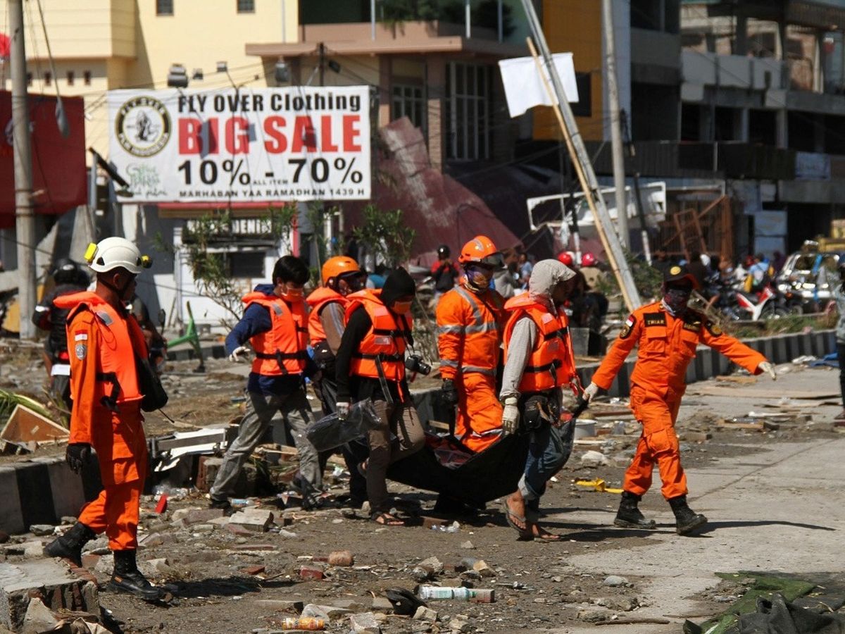 Search-and-rescue workers helping a survivor escape the rubble in Palu. (Credit: Antara Foto/Reuters)