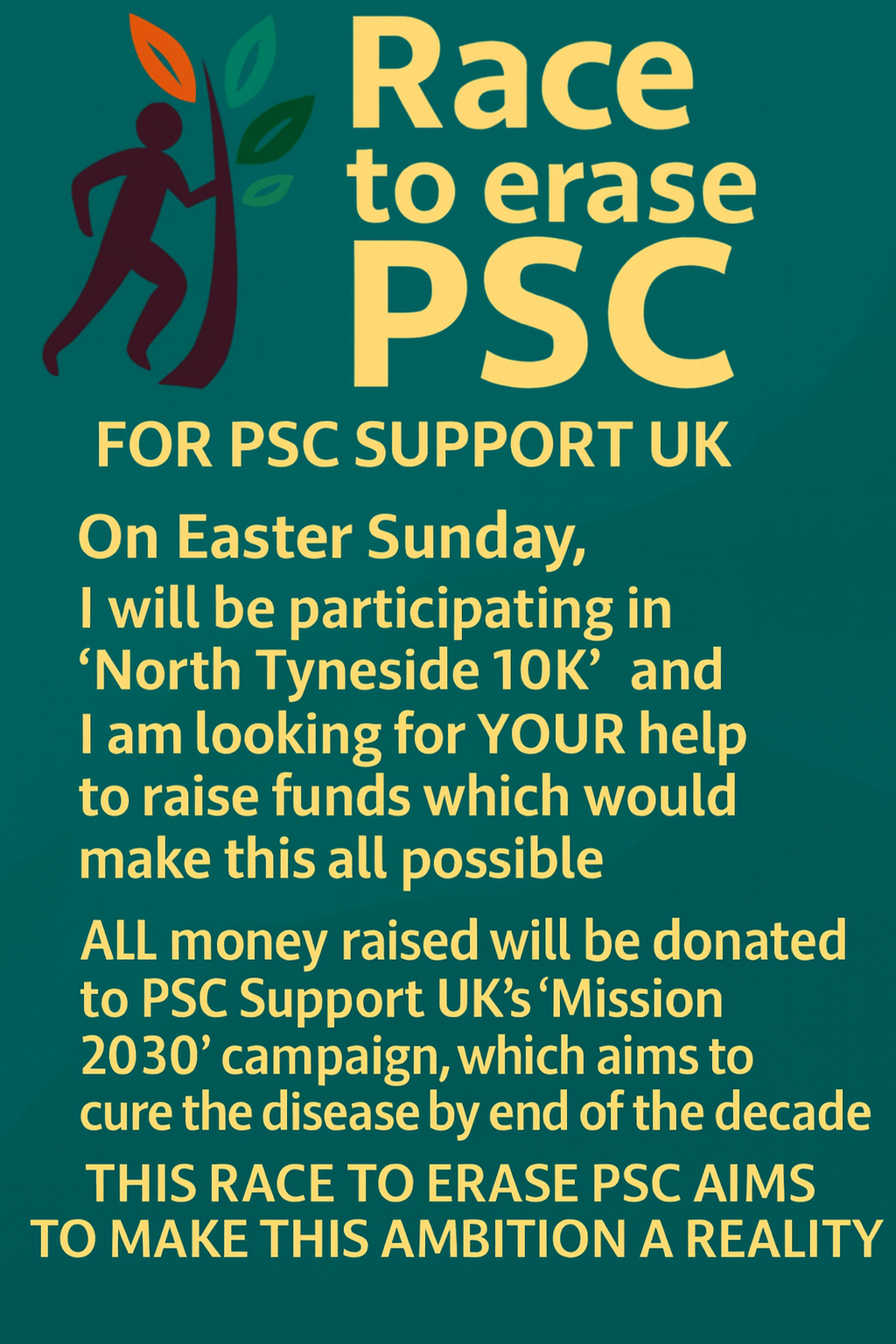 PSC shows no indicator of when it will worsen, and can suddenly cause major complications within weeks. PSC Support UK is the only British charity actively researching to find a cure for the disease. Their 'Mission 2030' campaign has the aim to cure all patients of the disease within the next 5 years. And with this in mind, I have taken it upon myself to run the North Tyneside 10k this upcoming Easter, in order to raise money and awareness for the cause. However I cannot do this alone. With your help and generosity, supported by donations and fundraising activities, this will all be possible. Any effort made to support would go towards a great cause which would not only save my life, but the lives of hundreds, if not thousands, of others nationally.