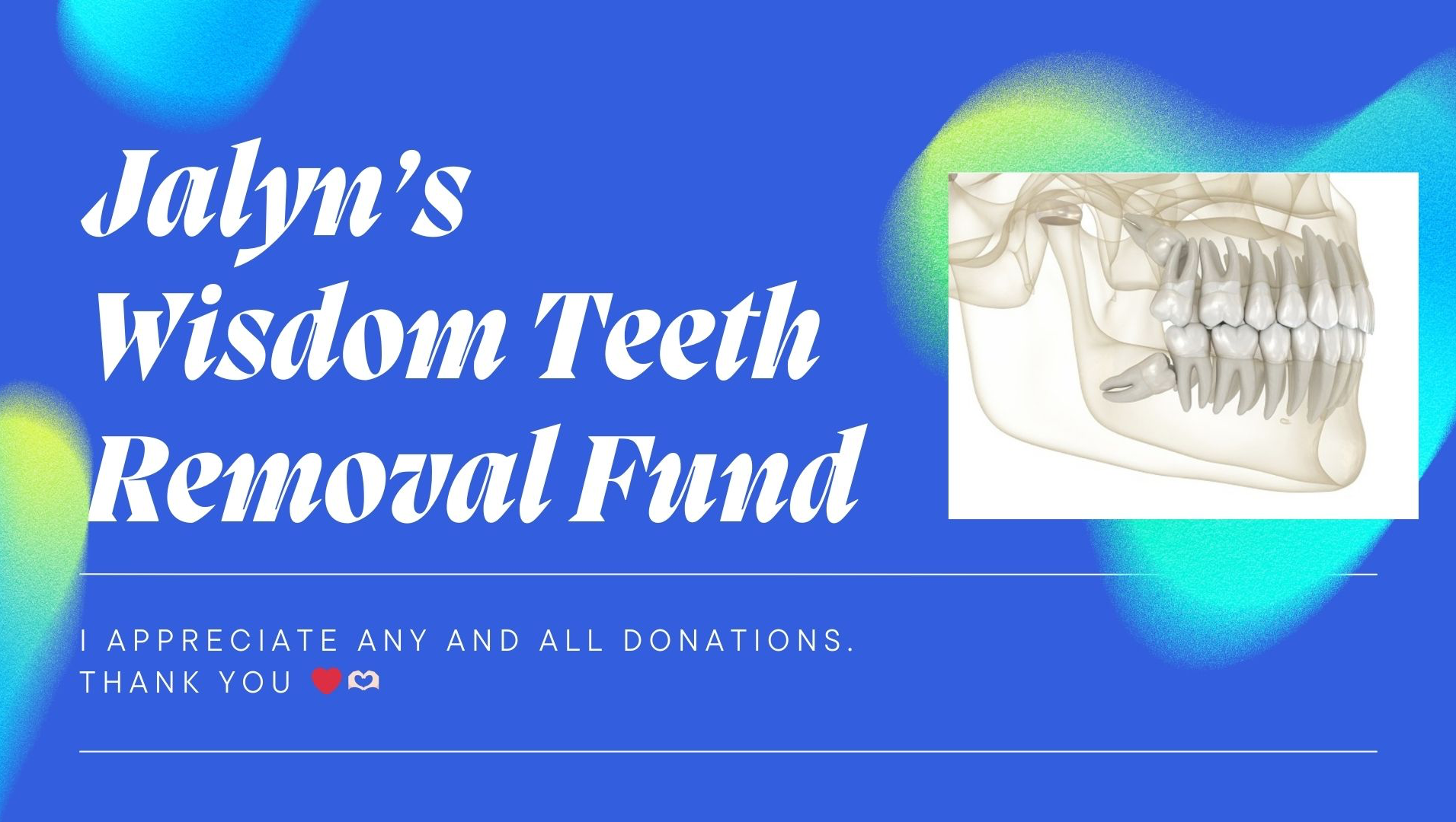 Hello everyone, Jalyn here. I’m reaching out for support as I navigate a pretty urgent dental situation. My (impacted) wisdom teeth have been causing me a lot of pain, and I need to get them removed as soon as possible. Unfortunately, with my current expenses here in the big city—especially working hard to stay on top of rent and bills—this procedure is just out of reach financially. Any help, big or small, would mean the world to me and would go directly toward covering the cost of surgery and recovery. If you can donate or even just share this, I’d be beyond grateful. Thank you so much for your kindness and support! Thank you ❤️❤️❤️❤️