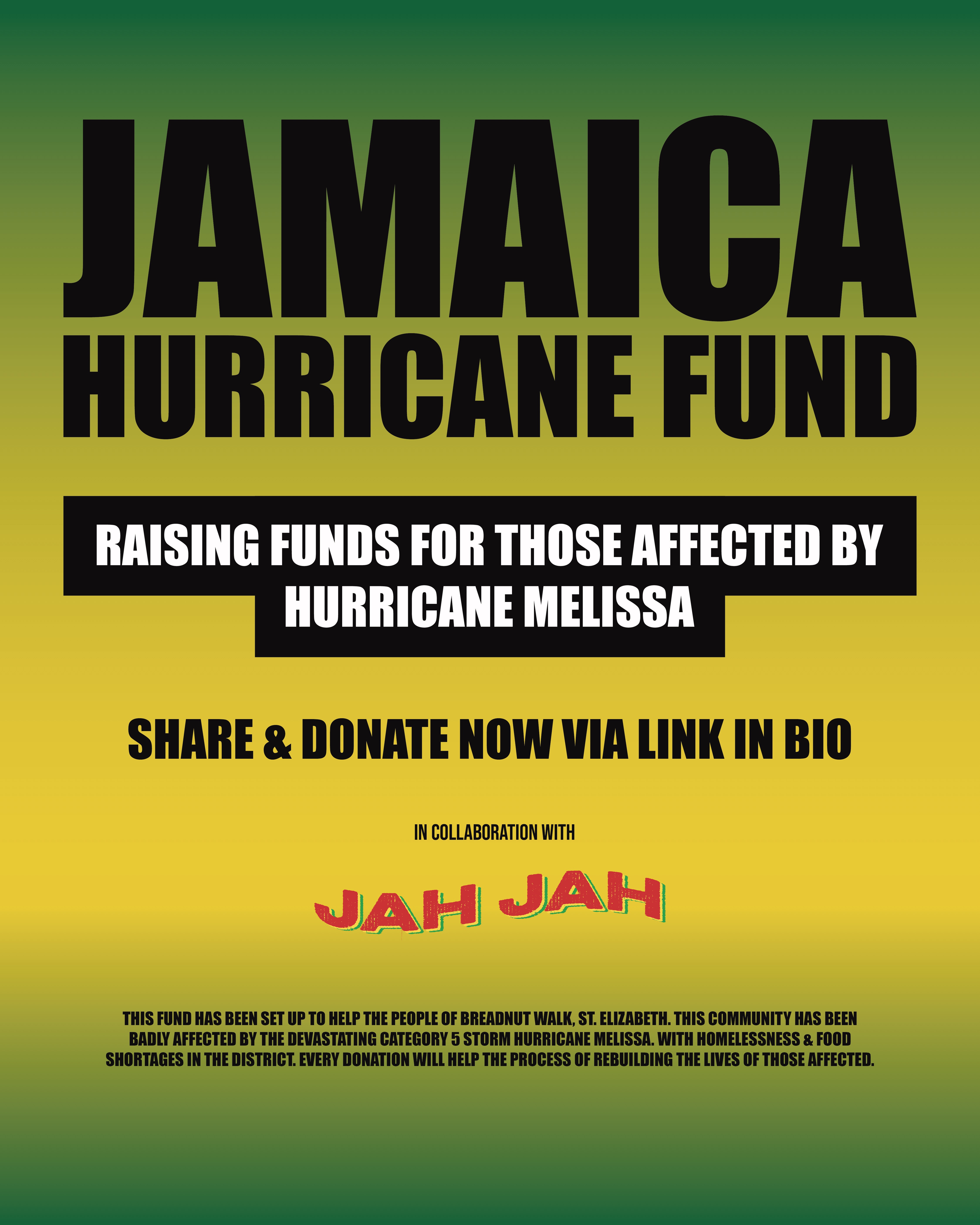 This fund exists to go directly to the community in Breadnut Walk, St. Elizabeth providing support to help them rebuild their lives and give aid/tools for them to live and build self reliance after this devastating natural catastrophe.