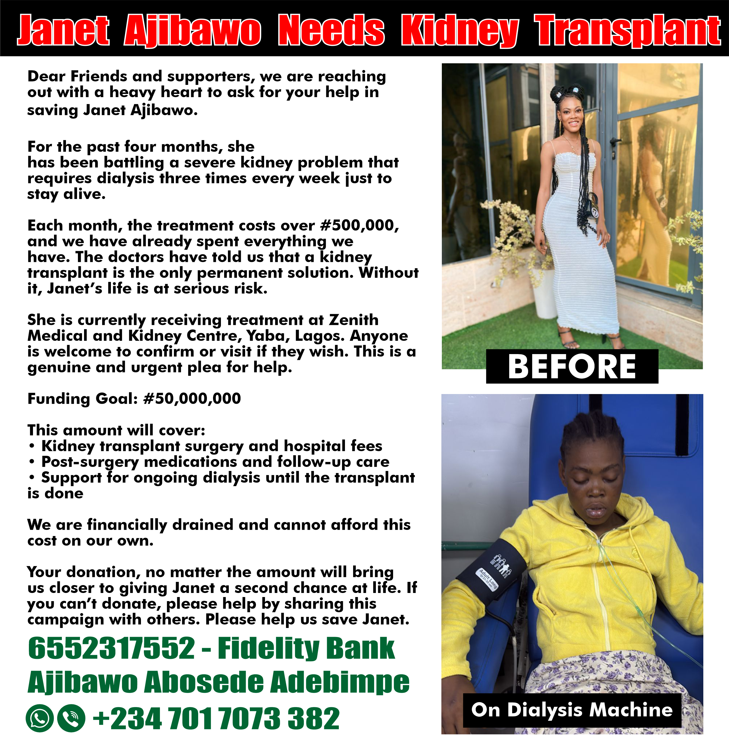 Each month, the treatment costs over #500,000 and we have already spent everything we have. The doctors have told us that a kidney transplant is the only permanent solution. Without it, Janet's life is at serious risk.