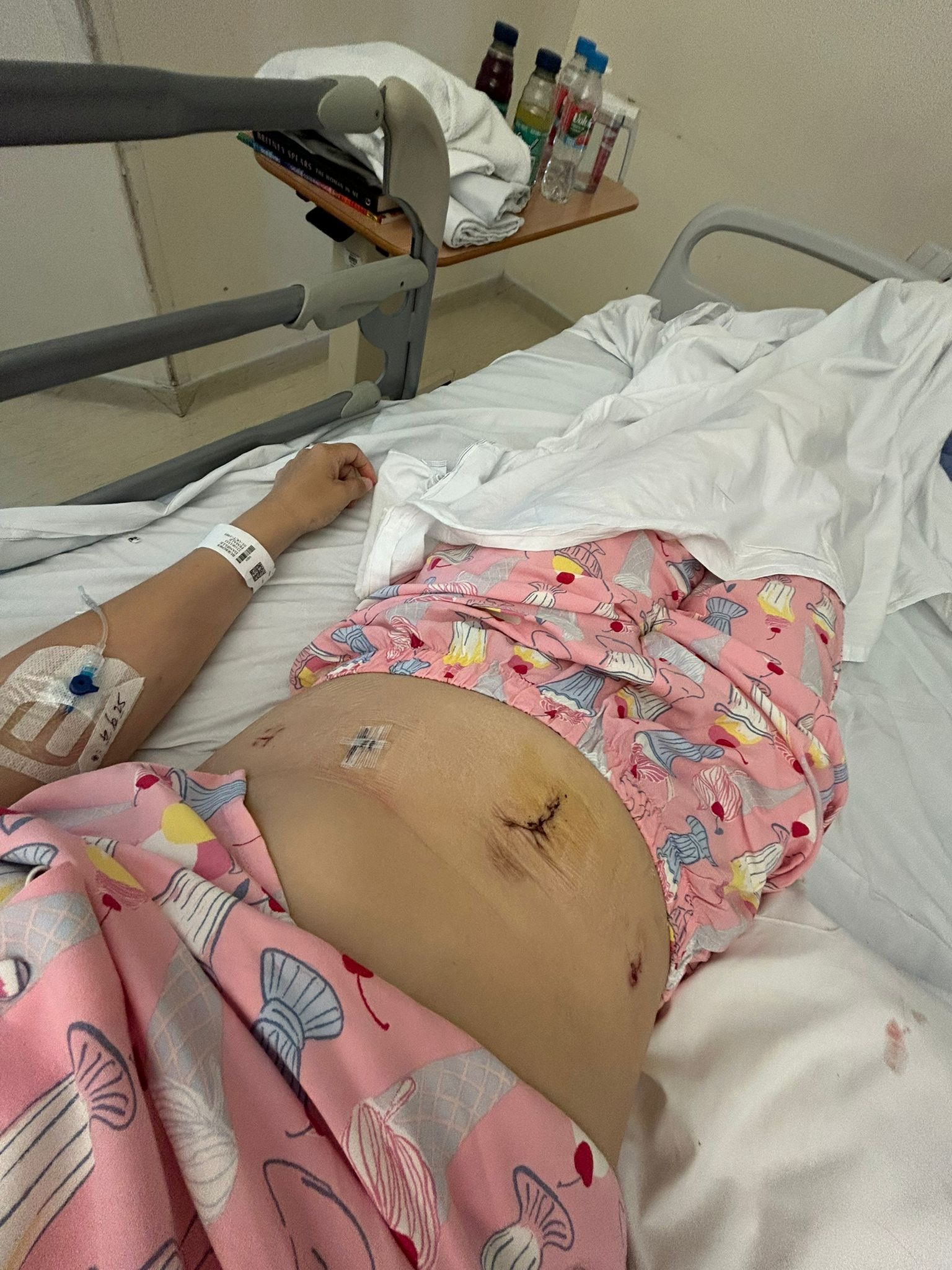 At 2am, she was transferred by blue lights to another hospital, where surgery took place first thing in the morning. Seven hours later, the operation was complete, and her stomach was thankfully left intact. Biopsies were taken, but they were contaminated and couldn’t be used.