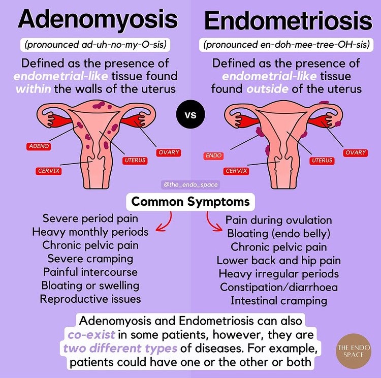 For context, endometriosis is a chronic inflammatory disease where tissue similar to the uterine lining grows outside the uterus, causing lesions, cysts, adhesions, and nerve involvement. In my case, the disease is affecting my ovaries, pelvic cavity, ligaments, and possibly the intestines, and adenomyosis is causing additional pain, inflammation, and heavy bleeding inside the uterine muscle.