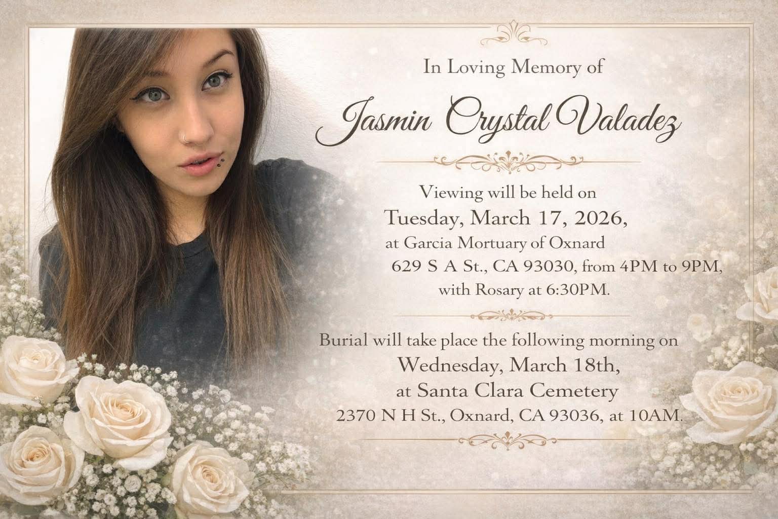 We are heartbroken to share the passing of our beloved sister Jazmin Crystal Valadez at only 30 years old. She leaves behind two beautiful children, her 8-year-old son Aiden and 7-year-old daughter Delilah, who now face life without their mother. She is survived by her husband, mother Maria Cruz Huerta and her siblings René Huerta, Francisco Valadez, Alvaro Valadez, Mary Valadez, and two nephews René (Peeps) Huerta II and Manny Valadez. Our family has already endured the painful loss of her father Manuel Valadez, who passed away 14 years ago from complications related to leukemia, and this tragedy has brought another deep wave of grief into our lives.