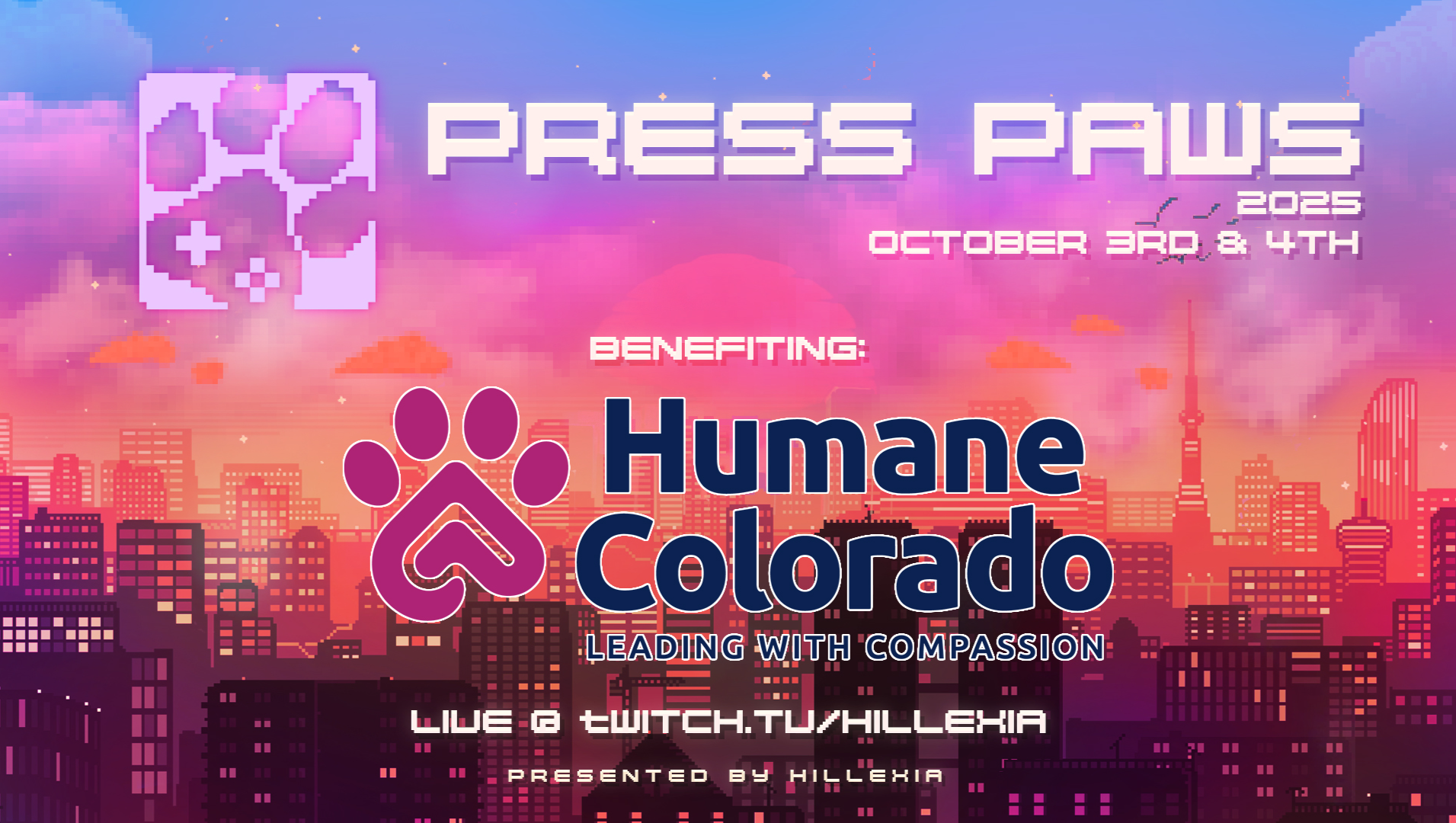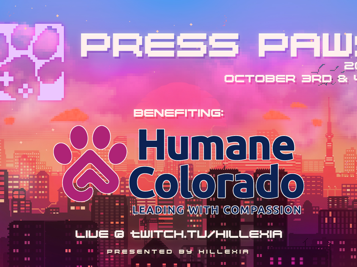 Press Paws is a Denver-based charity that airs live on the platform, Twitch.tv, specifically, on the channel, twitch.tv/hillexia. This charity is made of many gaming friends who want bring their communities and friends together to play video games while also bringing awareness to local shelters, specifically, Humane Colorado, and raise money for whatever resources they need! We have viewers and supporters from all over the country and as of last year, supported from outside the U.S. as well!