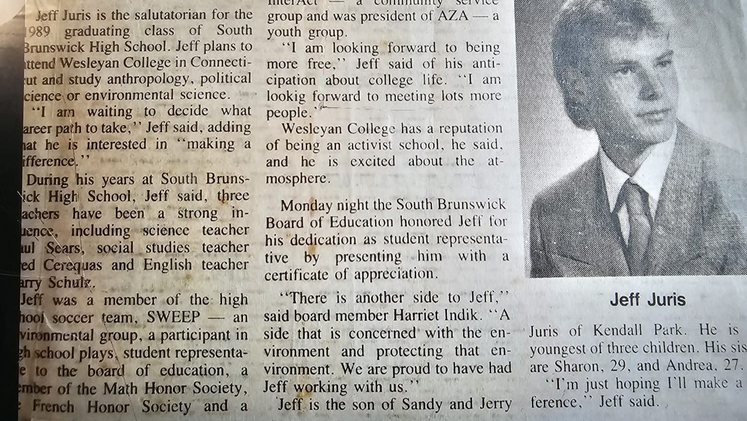 Which Graduates Are Eligible? We have discussed this Award with the administration at South Brunswick High School in NJ where Jeff was a standout scholar, athlete and activist, and they have warmly invited us to work with them to bestow this Award during the graduation award ceremonies to one or more selected recipients each year. We hope to be able to expand in future years to bestow Awards to graduates of the universities at which he attended and taught.