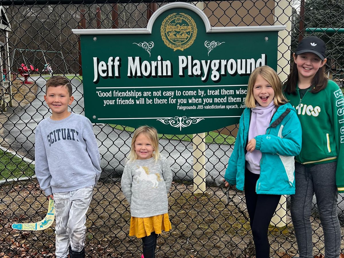 I was only 10 years old, Matt was 12, and Jeff was 15. Following our loss, my parents created the Jeff Morin Memorial Scholarship fund. They awarded scholarships to graduating Nashua High School students for many years. When my parents eventually moved, we began donating Scholarship money to the City of Nashua, NH. Nashua now has Jeff's Park (Roby park where we always went sledding as kids). So many people send me pictures of their kids playing there and it is so amazing to see. Many childrens sports in Nashua have Jeff's name and Valedictorian Quote. I will get a random photo from someone with their child in one of these shirts now and then, and it means the world to me. The 4th of July event in Nashua is also sponsored by the Scholarship Fund.