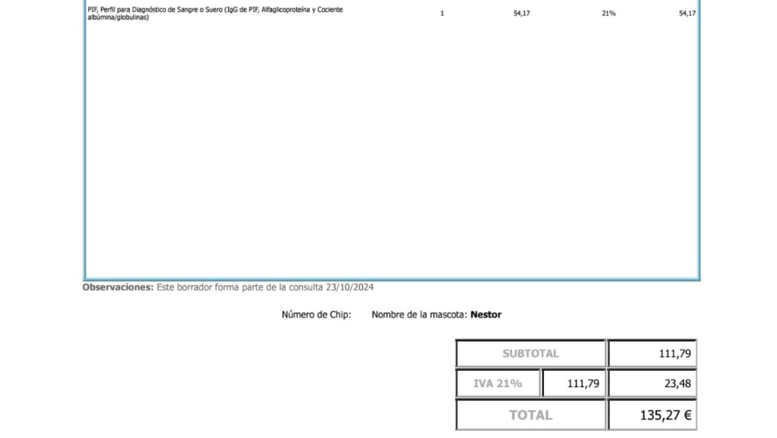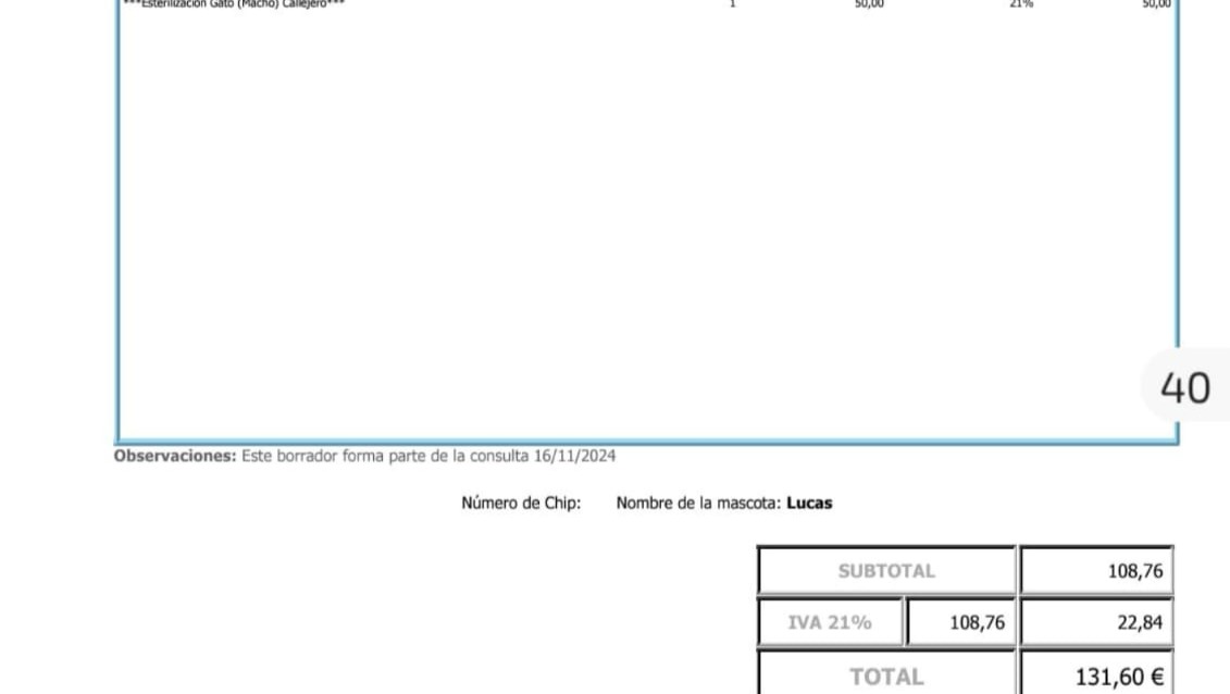 En cuánto al veterinario, es un santo, pero todo tiene su limite. Hasta que la deuda no quede saldada no podré atender más casos. A fecha de hoy la deuda asciende a 1350 €.