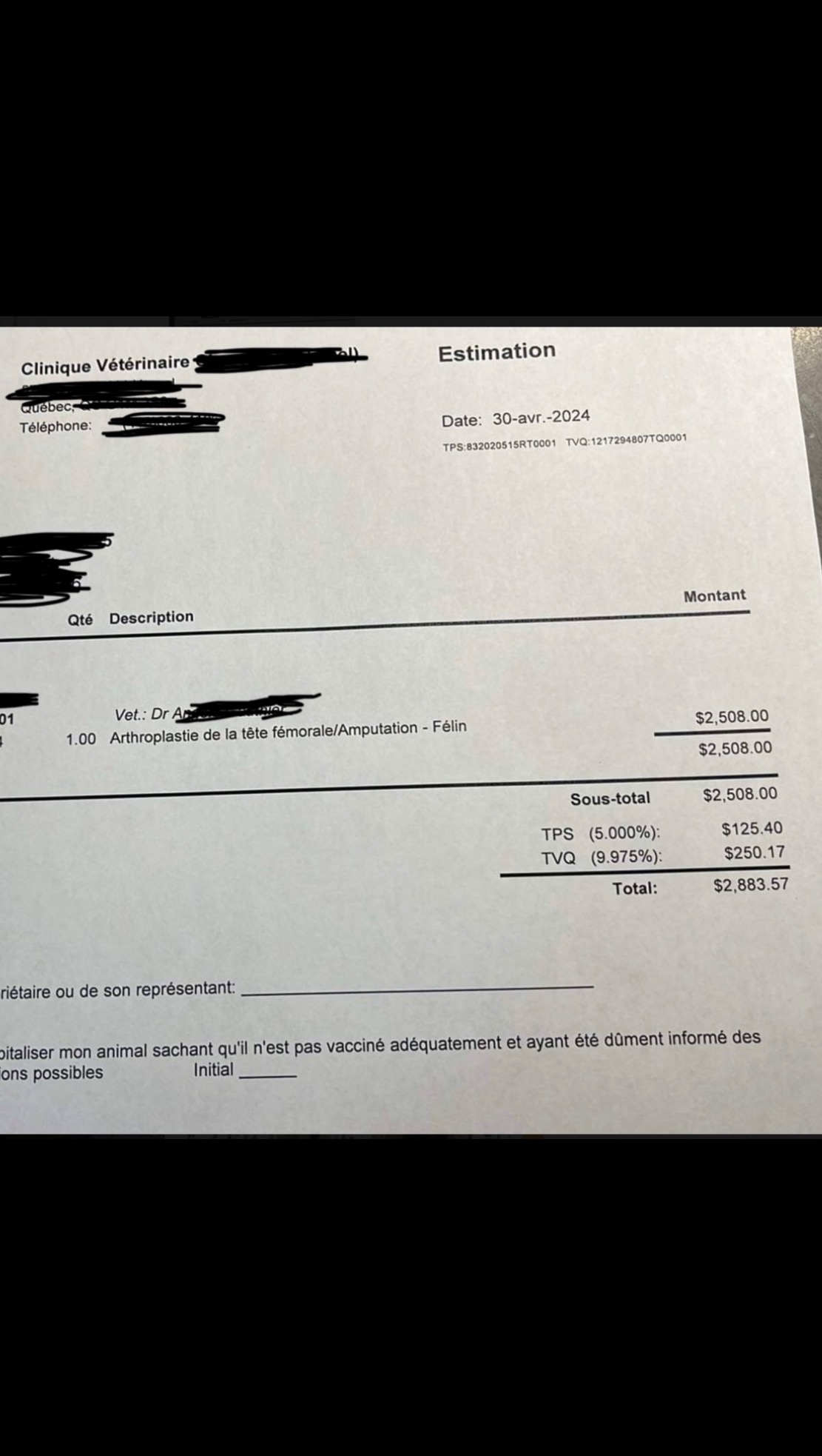 Je me suis rapidement rendu compte qu’il ne pouvait pratiquement plus marcher. Après une visite chez le vétérinaire d’urgence, on m’a annoncé qu’il avait la hanche fracturé et que les coûts s’élevaient à pratiquement 3000$ pour l’opération. (Opération 2883$ + médicament, + consultation donc environs 3000$ total)