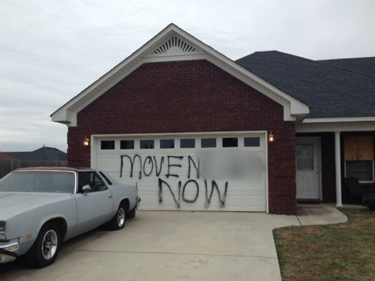 When Limestone County Sheriff’s deputies arrived, they found the scene pictured above. They discovered that rocks had been thrown through three windows and a racial slur had been spray-painted on her home.